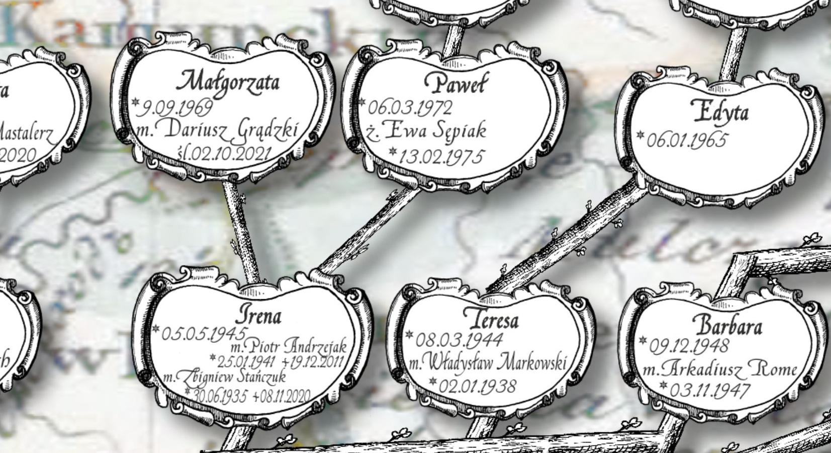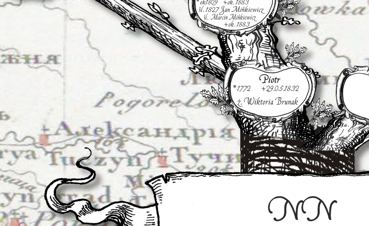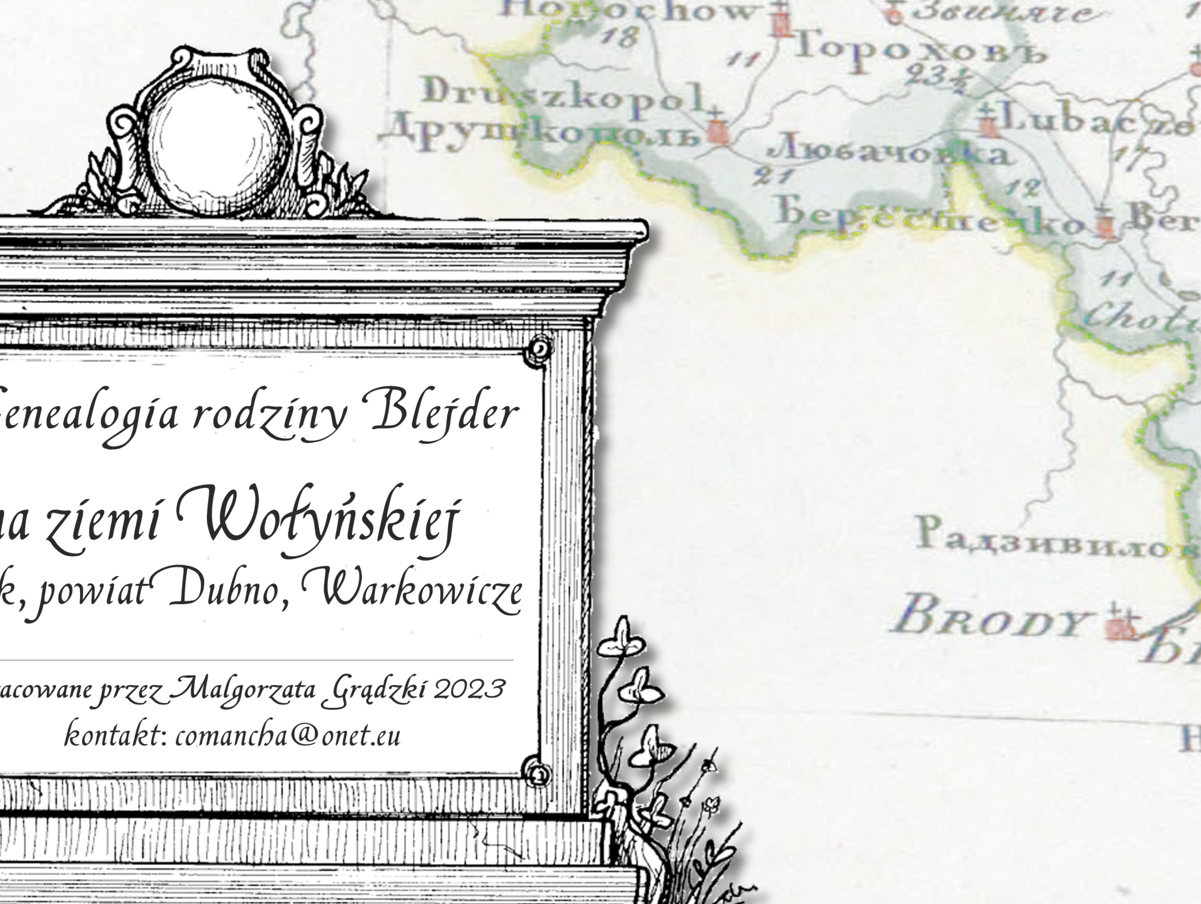 Drzewo genealogiczne rodziny Blejder zamieszkującej ziemię wołynska. Papier matowy japoński - bardzo dobra jakość,