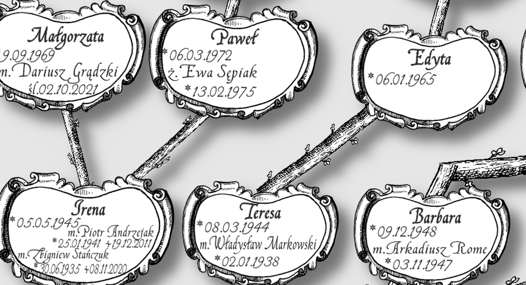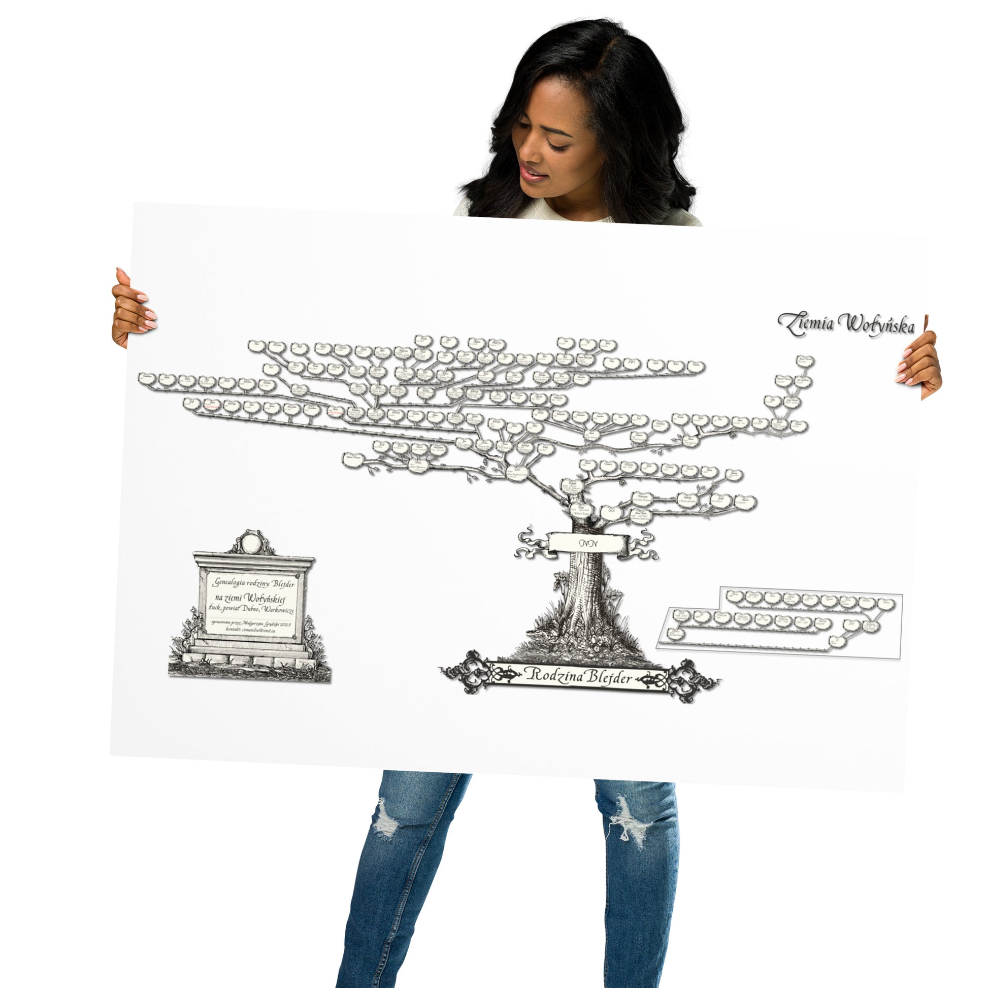 Drzewo genealogiczne rodziny Blejder zamieszkującej ziemię wołynska. Papier matowy japoński - bardzo dobra jakość,