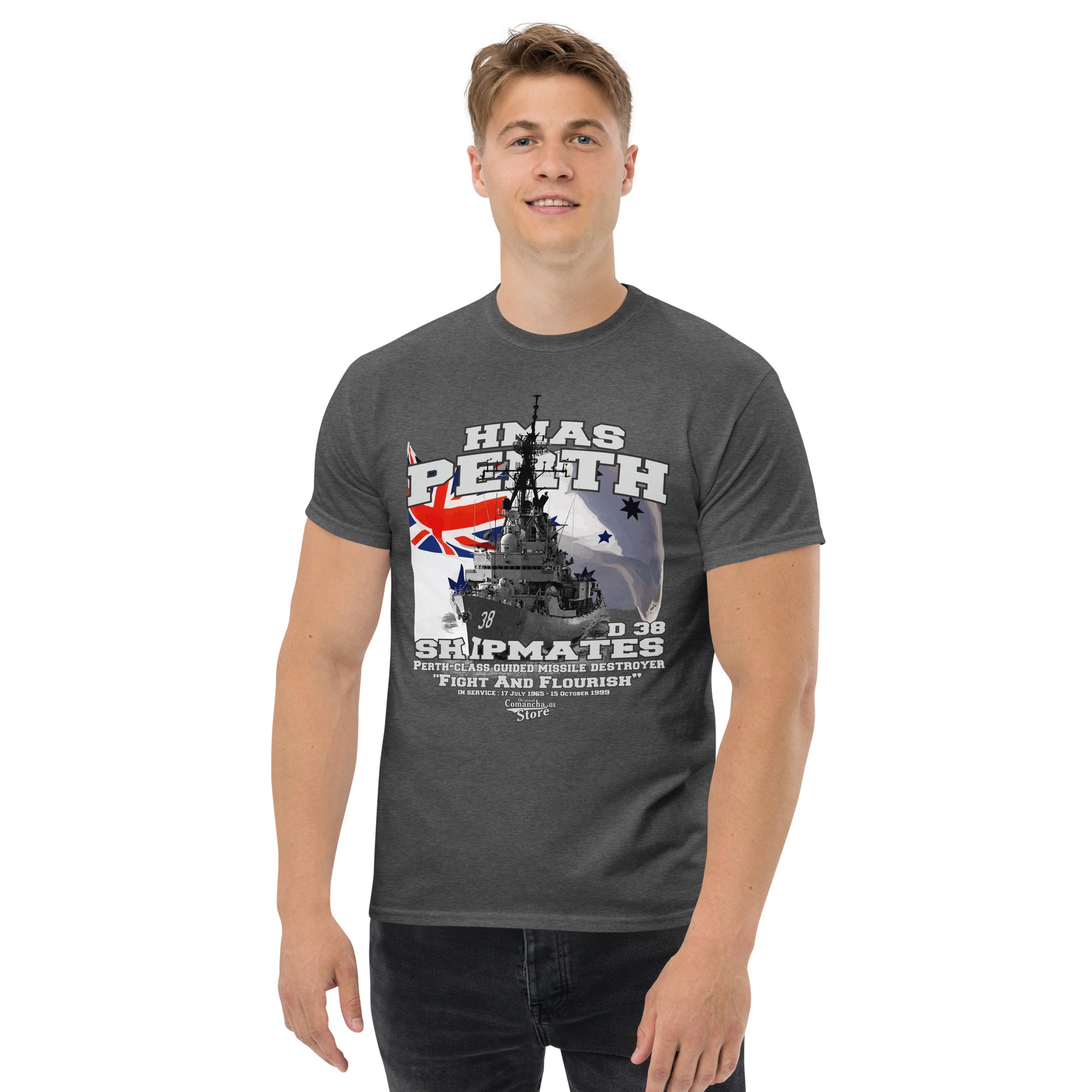 HMAS Perth D 38 Shipmates t-shirt, HMAS Perth Destroyer t-shirt, HMAS Perth (D 38) was the lead ship of the Perth-class guided missile destroyers operated by the Royal Australian Navy (RAN). Comancha Graphics.