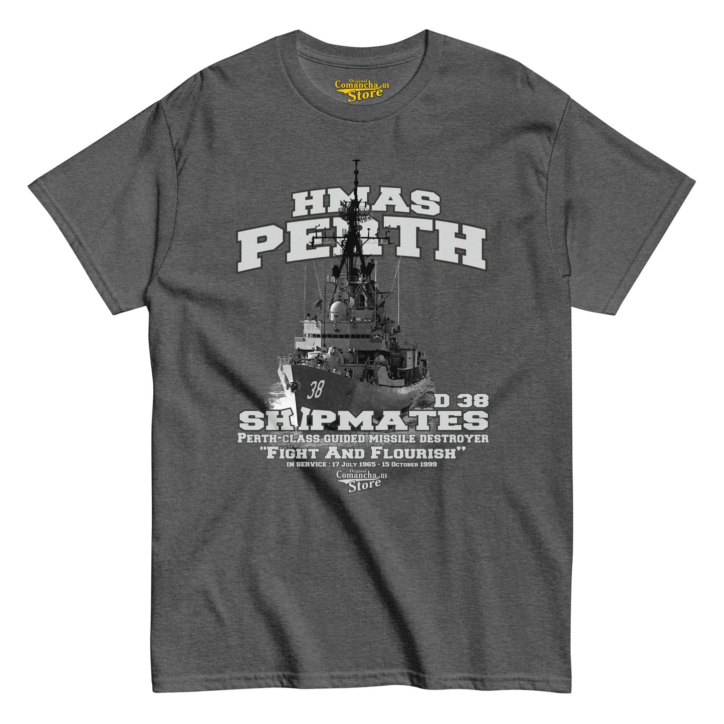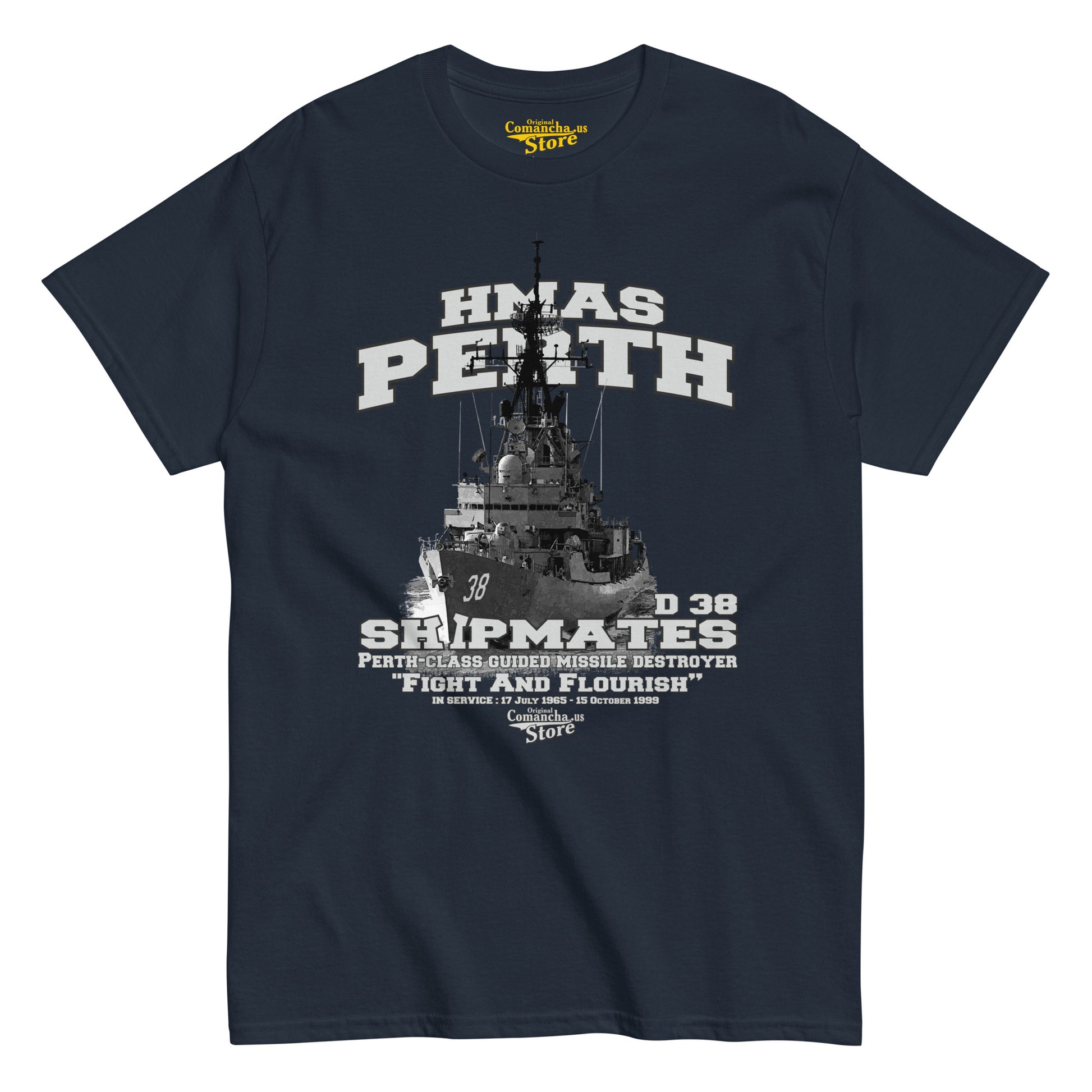 HMAS Perth D 38 t-shirt, HMAS Perth D 38 Destroyer t-shirt, HMAS Perth (D 38) was the lead ship of the Perth-class guided missile destroyers operated by the Royal Australian Navy (RAN). Comancha Graphics.