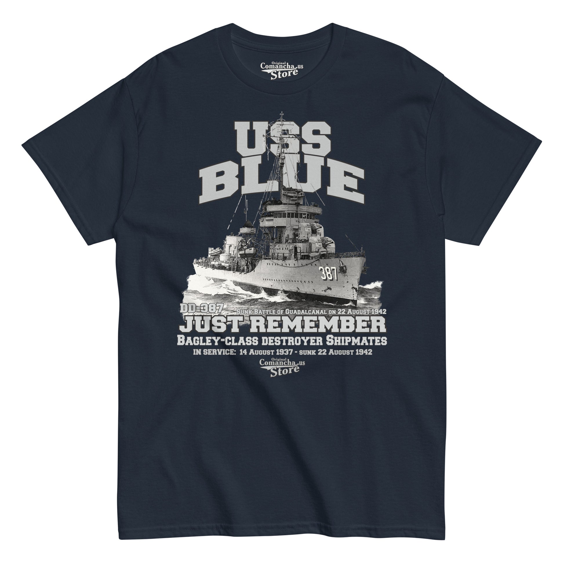 USS Blue DD-387 t-shirt, USS Blue DD-387 Shipmates tee, USS Blue DD-387, a Bagley-class destroyer, was the first United States Navy ship. Comancha Graphics Store.