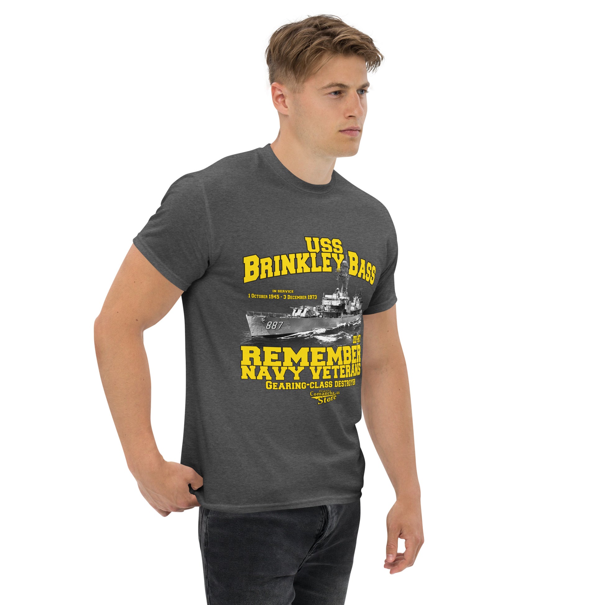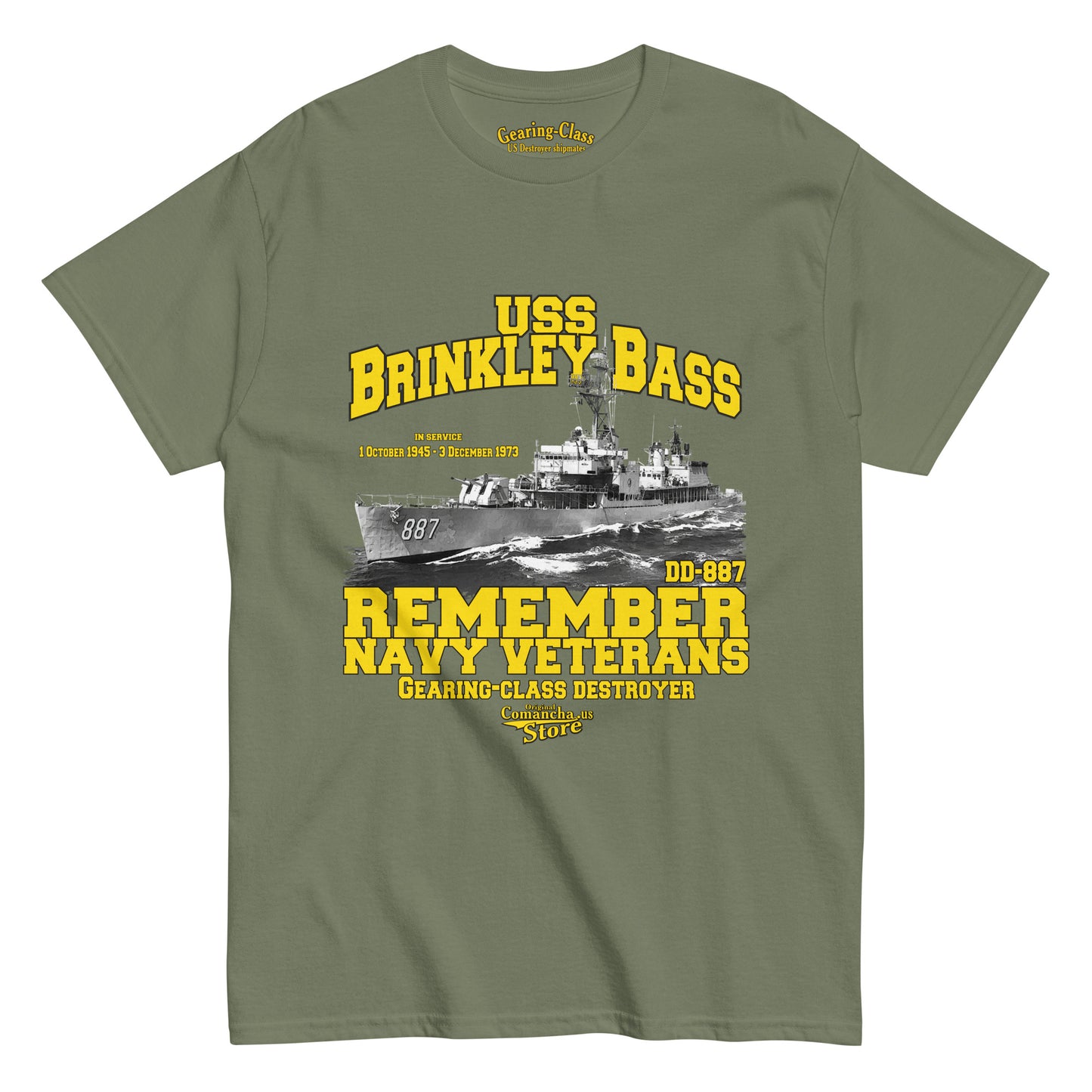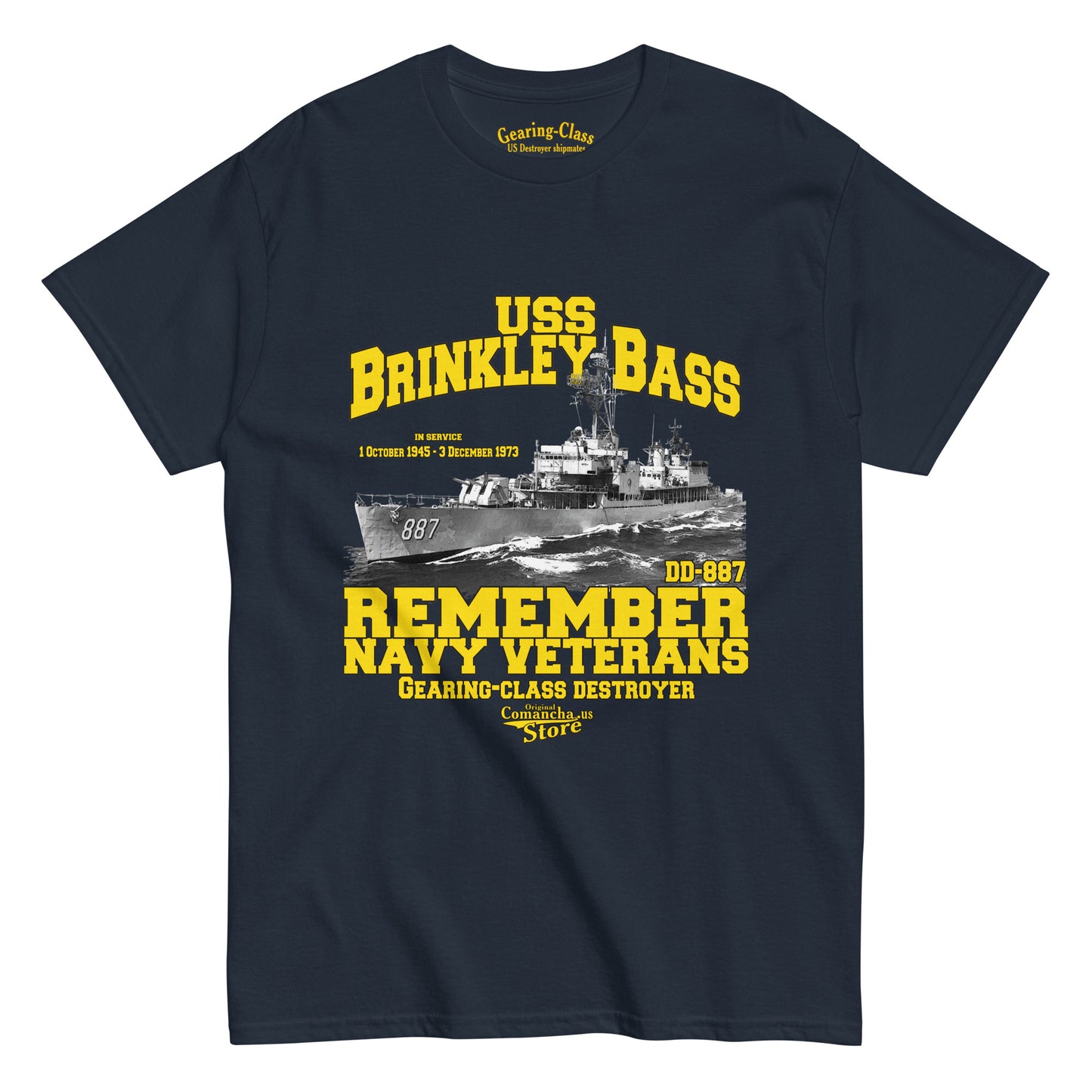 USS Brinkley Bass DD-887 t-shirt, USS Brinkley Bass (DD-887) was a Gearing-class destroyer in service with the United States Navy from 1945 to 1973. Comancha Graphics,