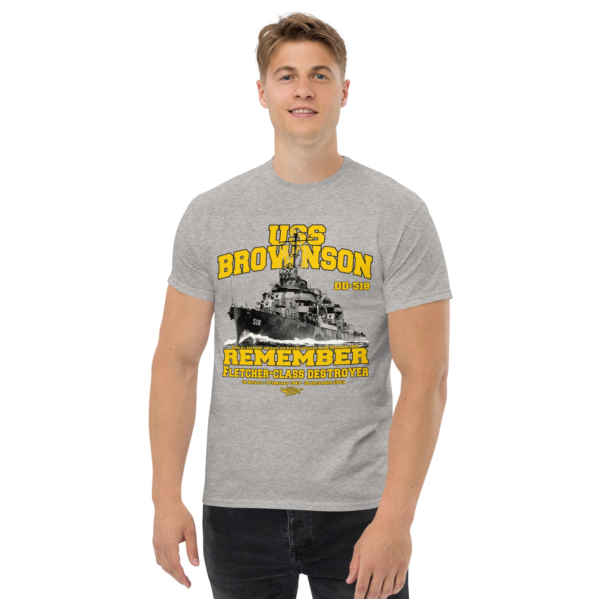 USS Brownson DD-518 destroyer T-shirt, USS Brownson DD-518 was a Fletcher-class destroyer of the United States Navy commissioned on 3 February 1943. She was sunk by Japanese aircraft off Cape Gloucester, New Britain on 26 December 1943. Comancha Store.