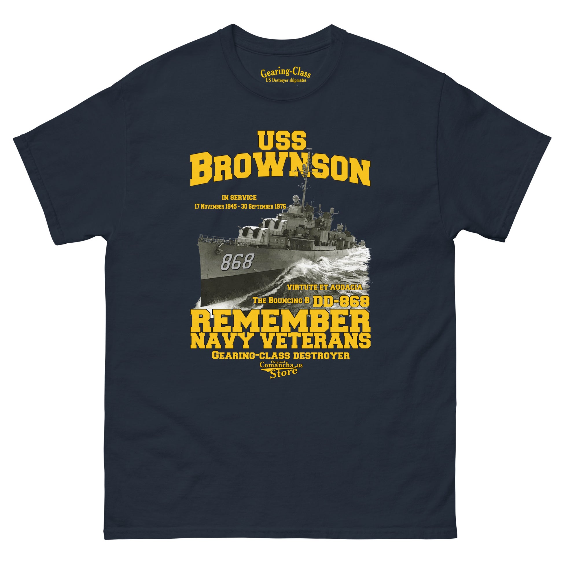USS Brownson DD-868 Shipmates t-shirt, USS Brownson (DD-868) was a Gearing-class destroyer and the second ship of the United States Navy to be named for Rear Admiral Willard H. Brownson, USN (1845–1935). Comancha Graphics,