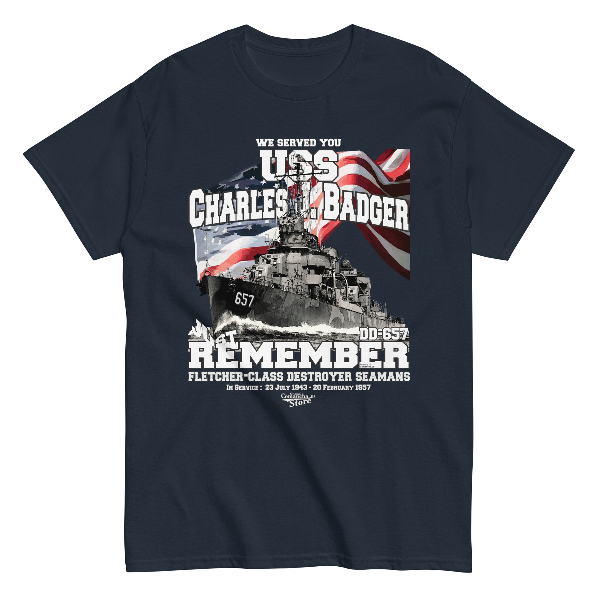 USS Charles J. Badger DD-657 destroyer t-shirt, USS Charles J. Badger (DD-657) was a Fletcher-class destroyer of the United States Navy, Comancha Shop,