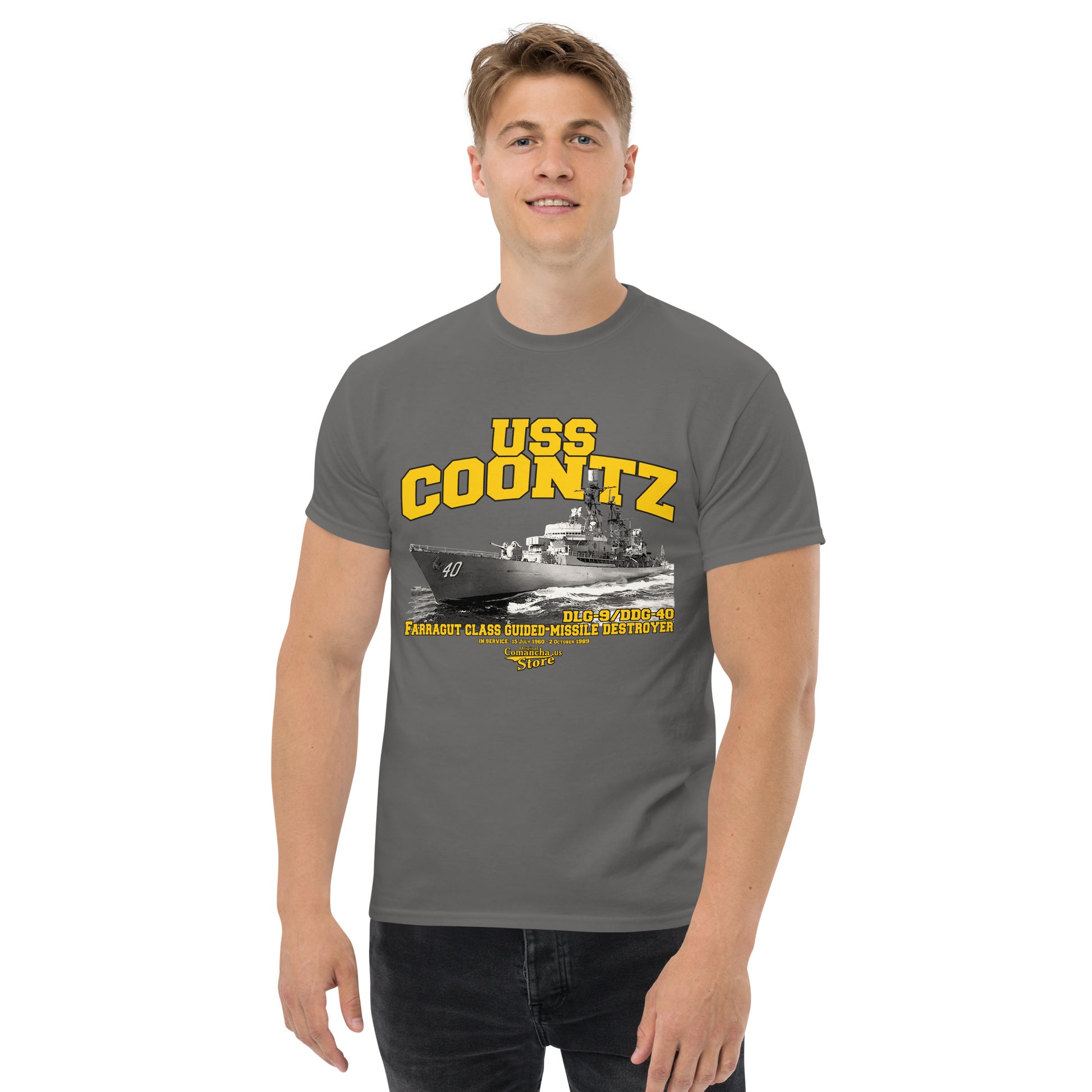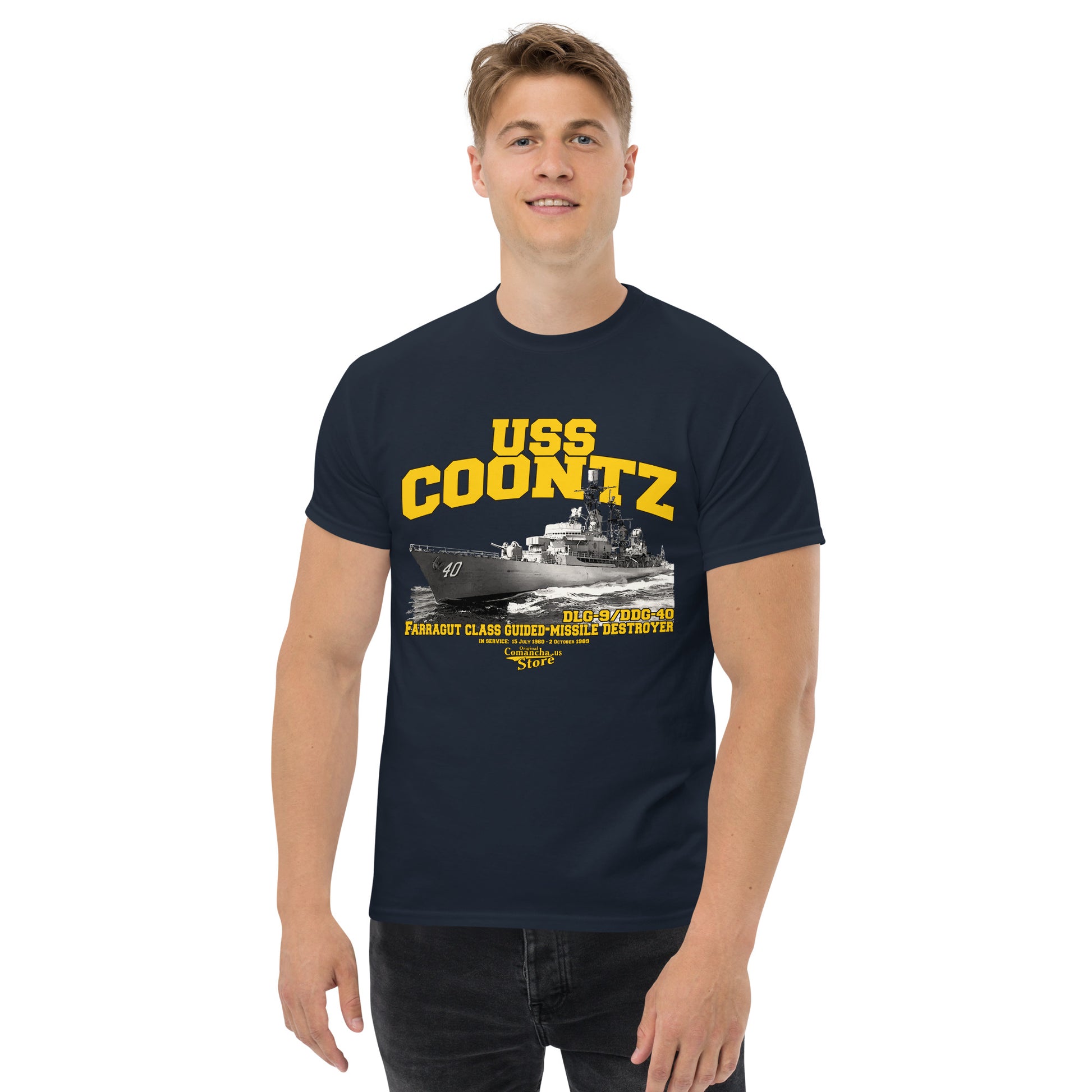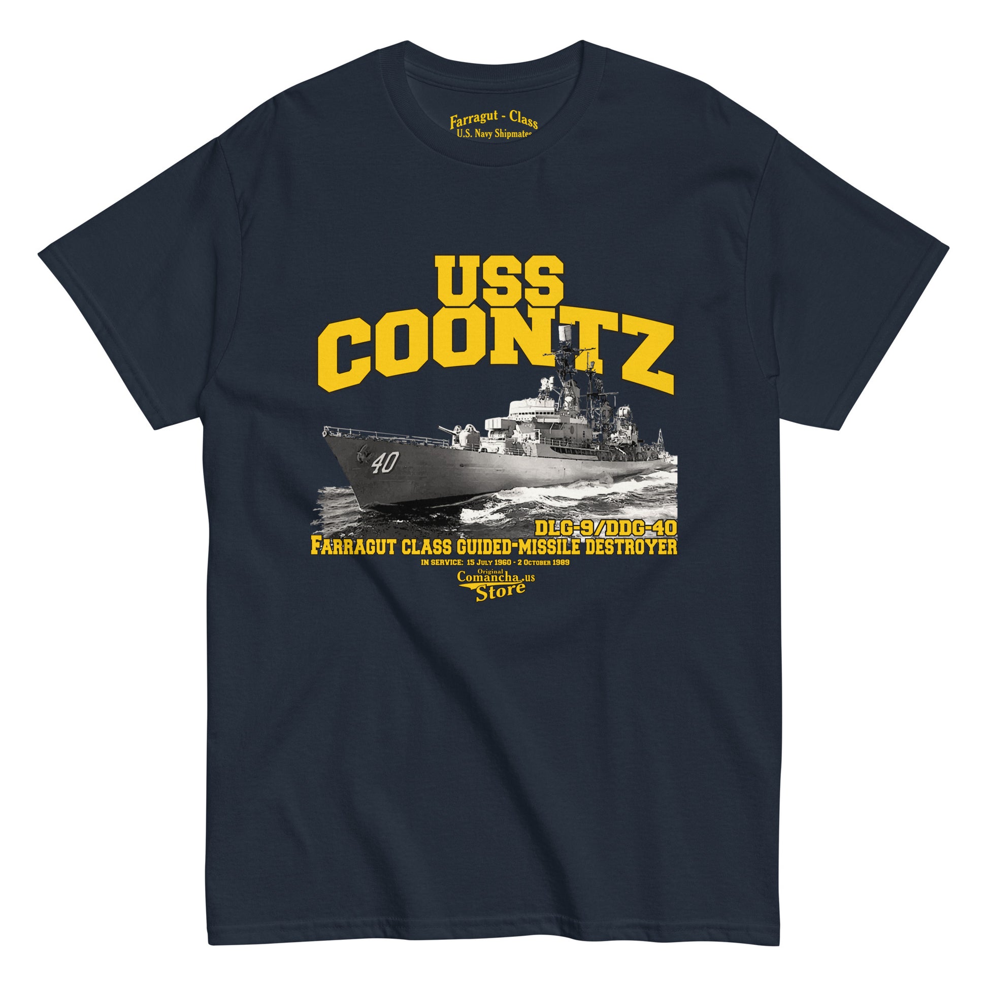 USS Coontz t-shirt, USS Coontz DLG-9 tee, USS Coontz DLG-9/DDG-40 was a Farragut-class destroyer leader/frigate in the United States Navy. Comancha Graphics,