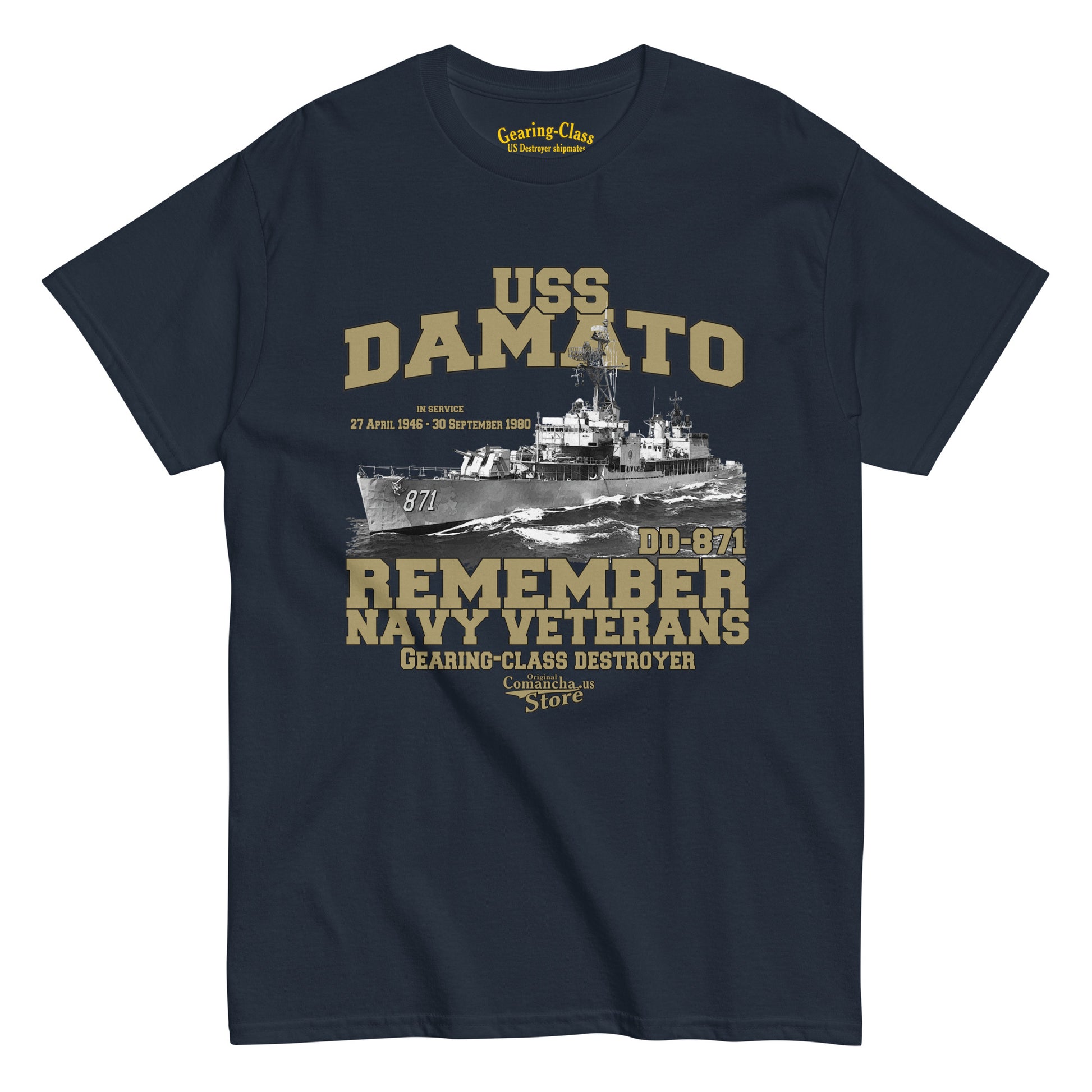 USS Damato DD-871 Tee, USS Damato (DD-871) was a Gearing-class destroyer of the United States Navy. She was named for Corporal Anthony P. Damato USMC (1922–1944), who was killed in action during the Battle of Eniwetok in the Marshall Islands and posthumously awarded the Medal of Honor. Comancha Graphics,
