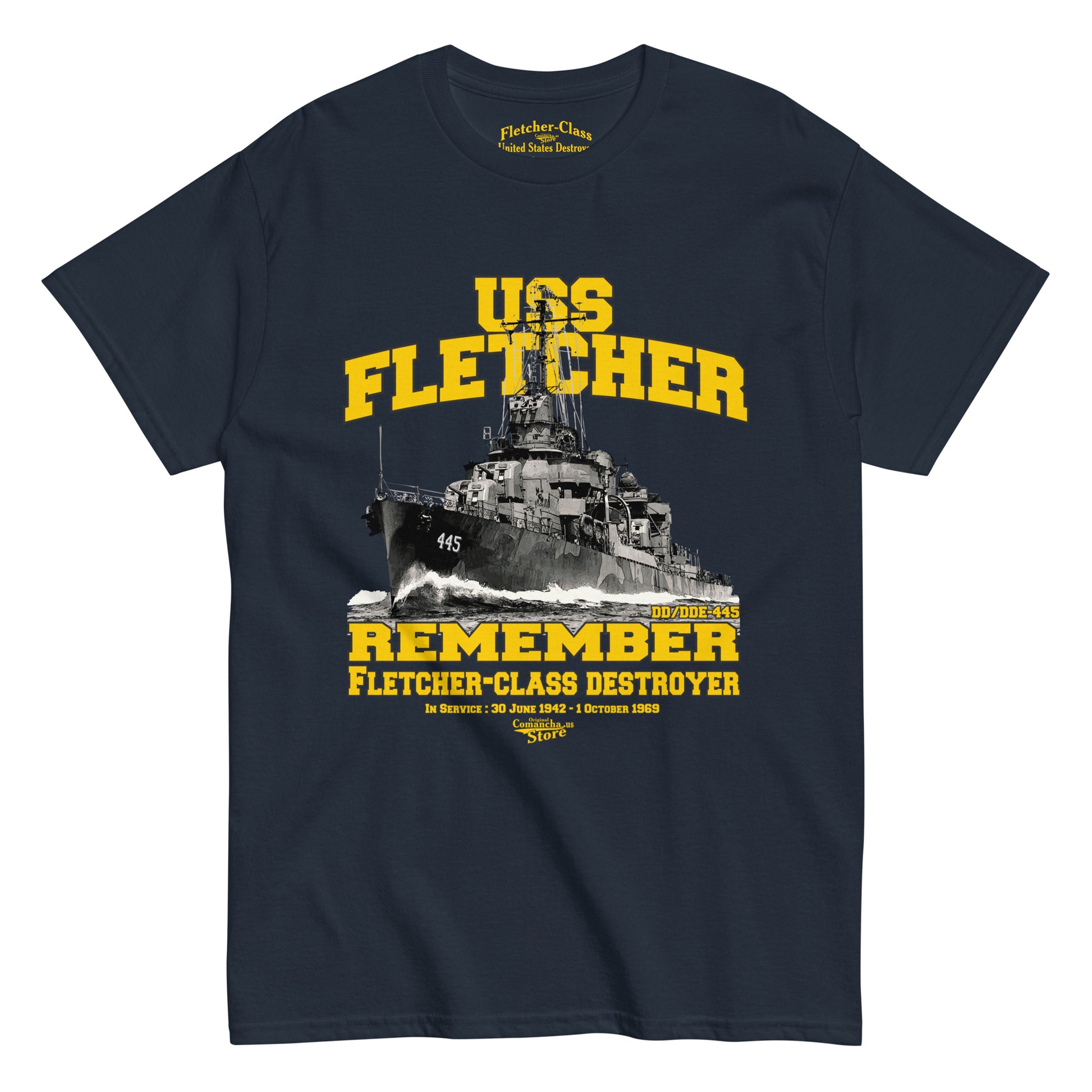 USS Fletcher DD/DDE-445 destroyer t-shirt, USS Fletcher (DD/DDE-445), named for Admiral Frank Friday Fletcher, was the lead Fletcher-class destroyer, and served in the Pacific during World War II. She received fifteen battle stars for World War II service, and five for Korean War service. Comancha Store.