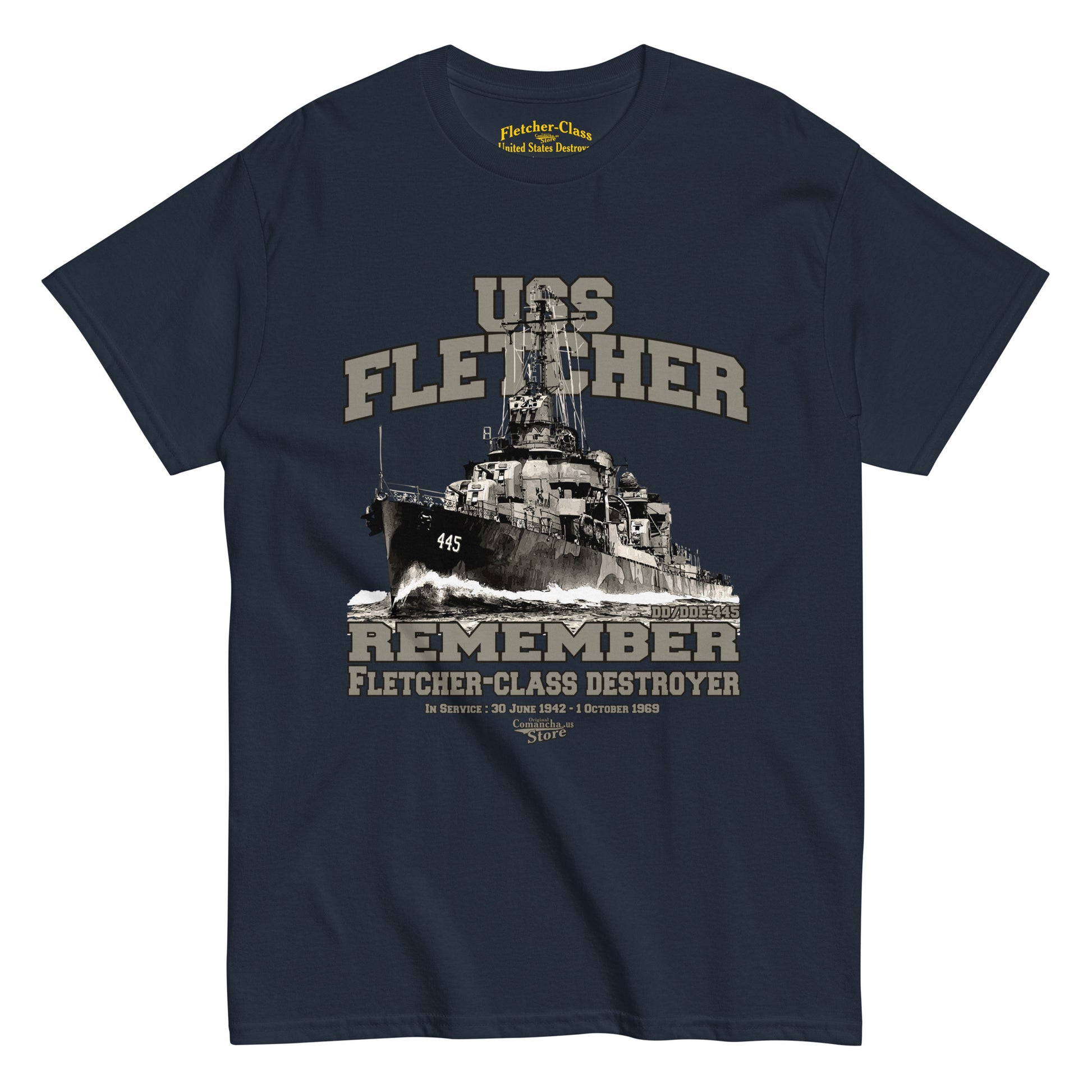 USS Fletcher DD/DDE-445 t-shirt, USS Fletcher (DD/DDE-445), named for Admiral Frank Friday Fletcher, was the lead Fletcher-class destroyer, and served in the Pacific during World War II. She received fifteen battle stars for World War II service, and five for Korean War service. Comancha Store.
