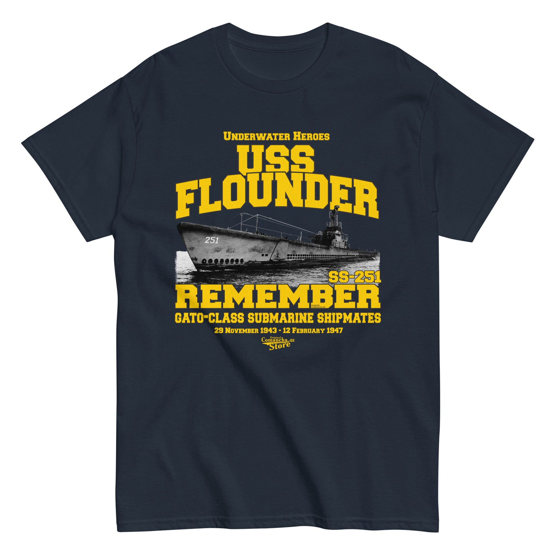 USS Flounder SS-251 submarine t-shirt, USS Flounder (SS-251), a Gato-class submarine, was the only ship of the United States Navy, Comancha Store,