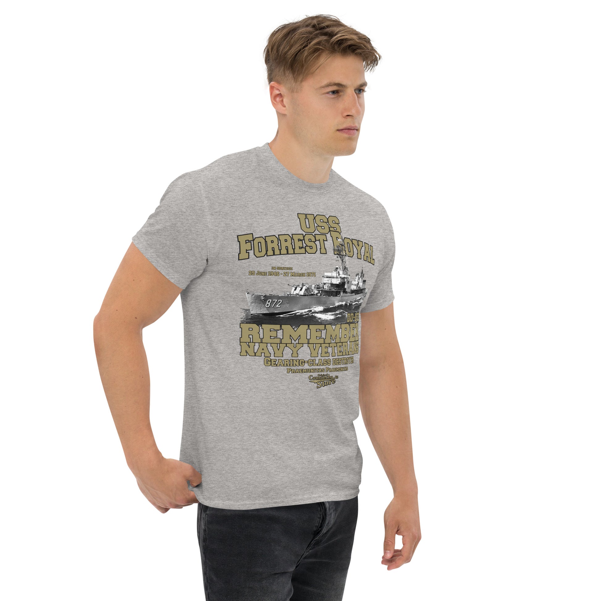 USS Forrest Royal DD-872 tee, USS Forrest Royal DD-872 was a United States Navy Gearing-class destroyer constructed following the end of World War II. The ship saw service in the Korean War and the Vietnam War before being sold to Turkey in 1971. Comancha Graphics,