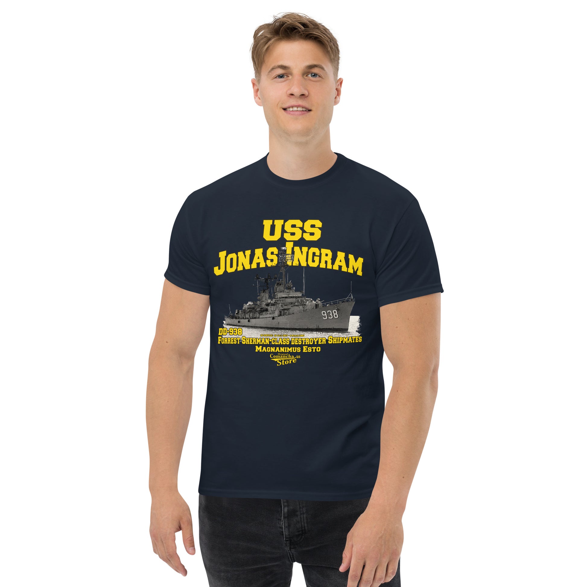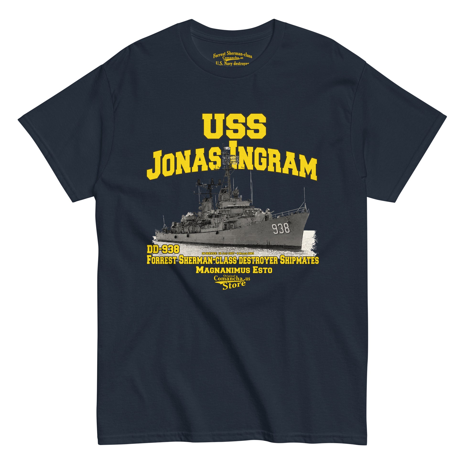 USS Jonas Ingram DD-938 Shipmates t-shirt, USS Jonas Ingram DD-938 t-shirt, Comancha Graphics, The 100% cotton men's classic tee will help you land a more structured look. It sits nicely, maintains sharp lines around the edges, and goes perfectly with layered streetwear outfits. Plus, it's extra trendy now!