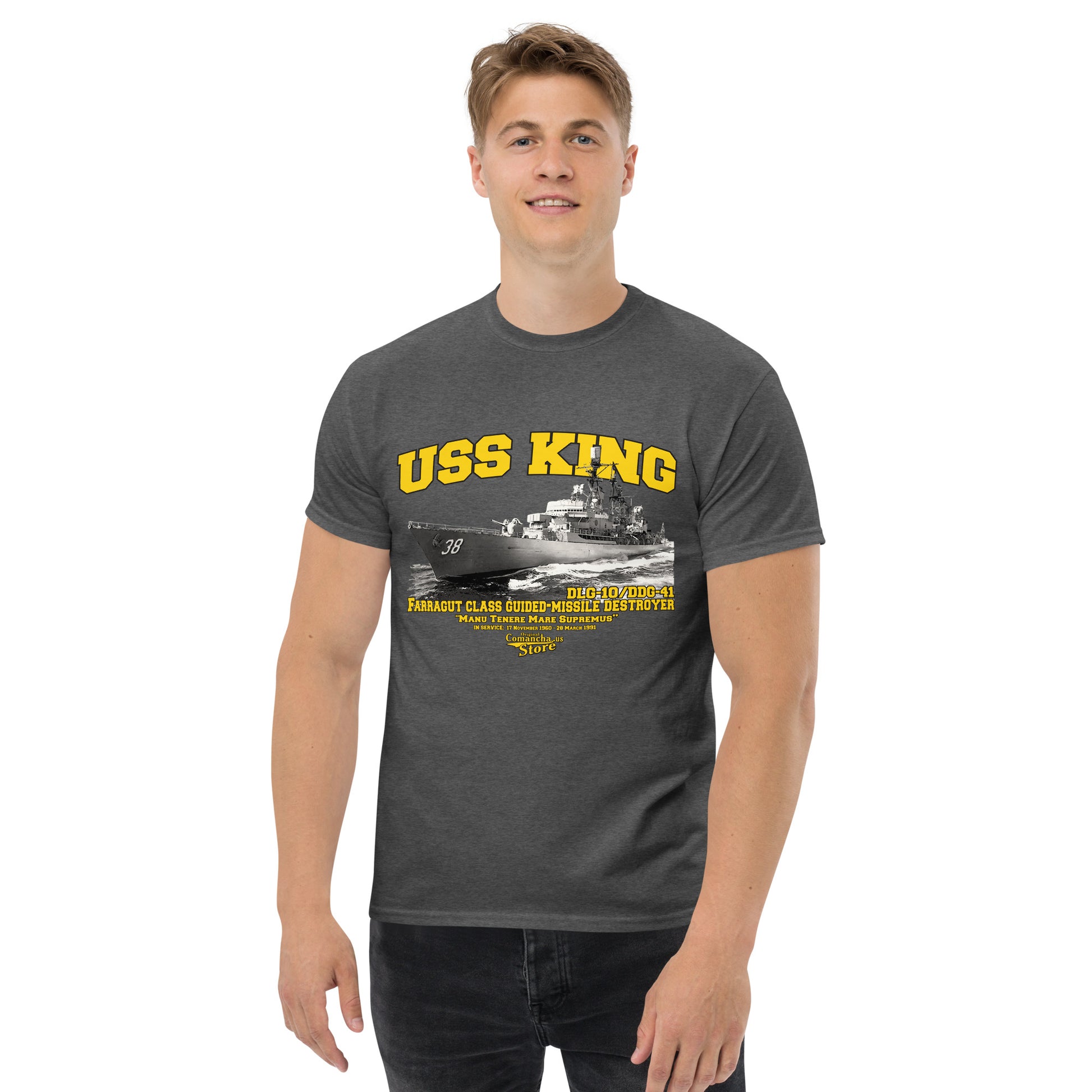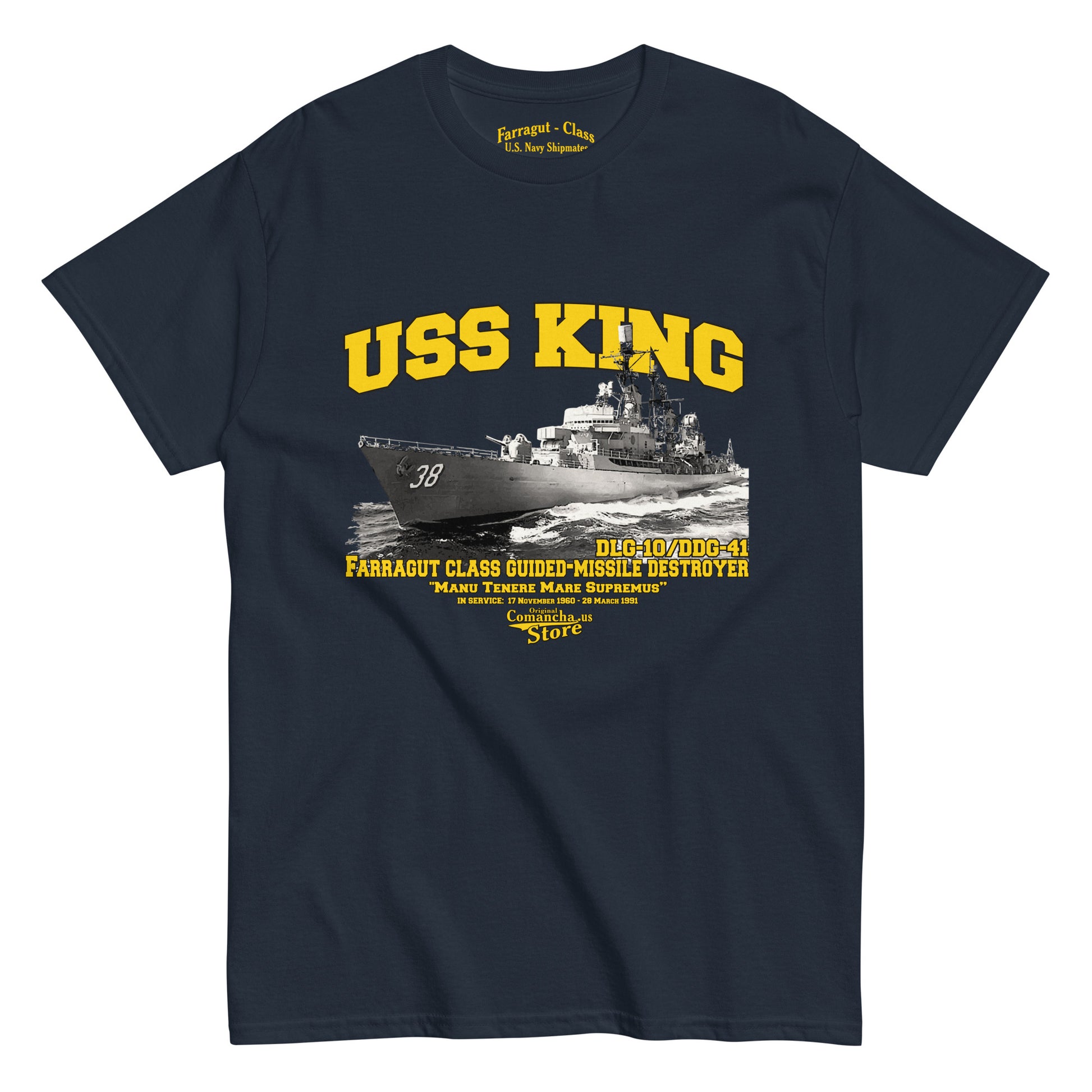 USS King Shipmates tee, USS King DLG-10 T-shirt, USS King DL-10/DLG-10/DDG-41 was a Farragut-class guided missile destroyer in the United States Navy.Comancha graphics,