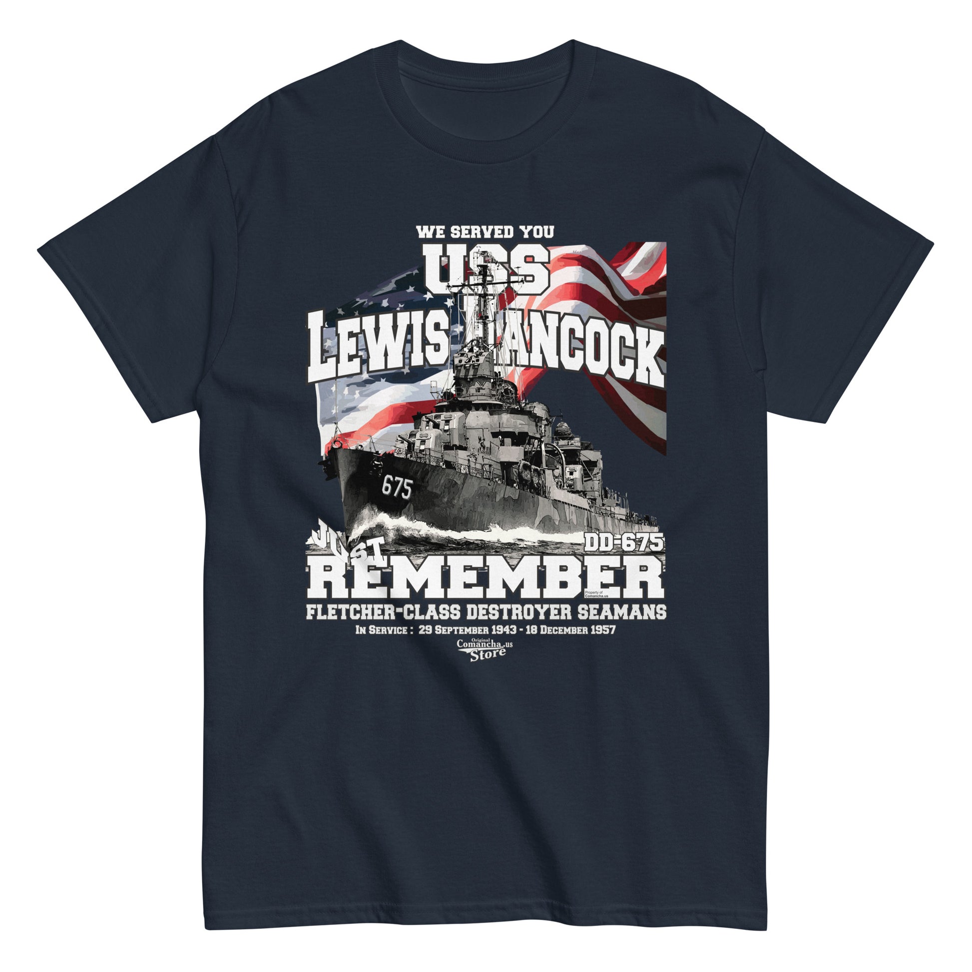 USS Lewis Hancock DD-675 destroyer t-shirt, USS Lewis Hancock (DD-675) was a Fletcher-class destroyer of the United States Navy, Comancha T-shirt,