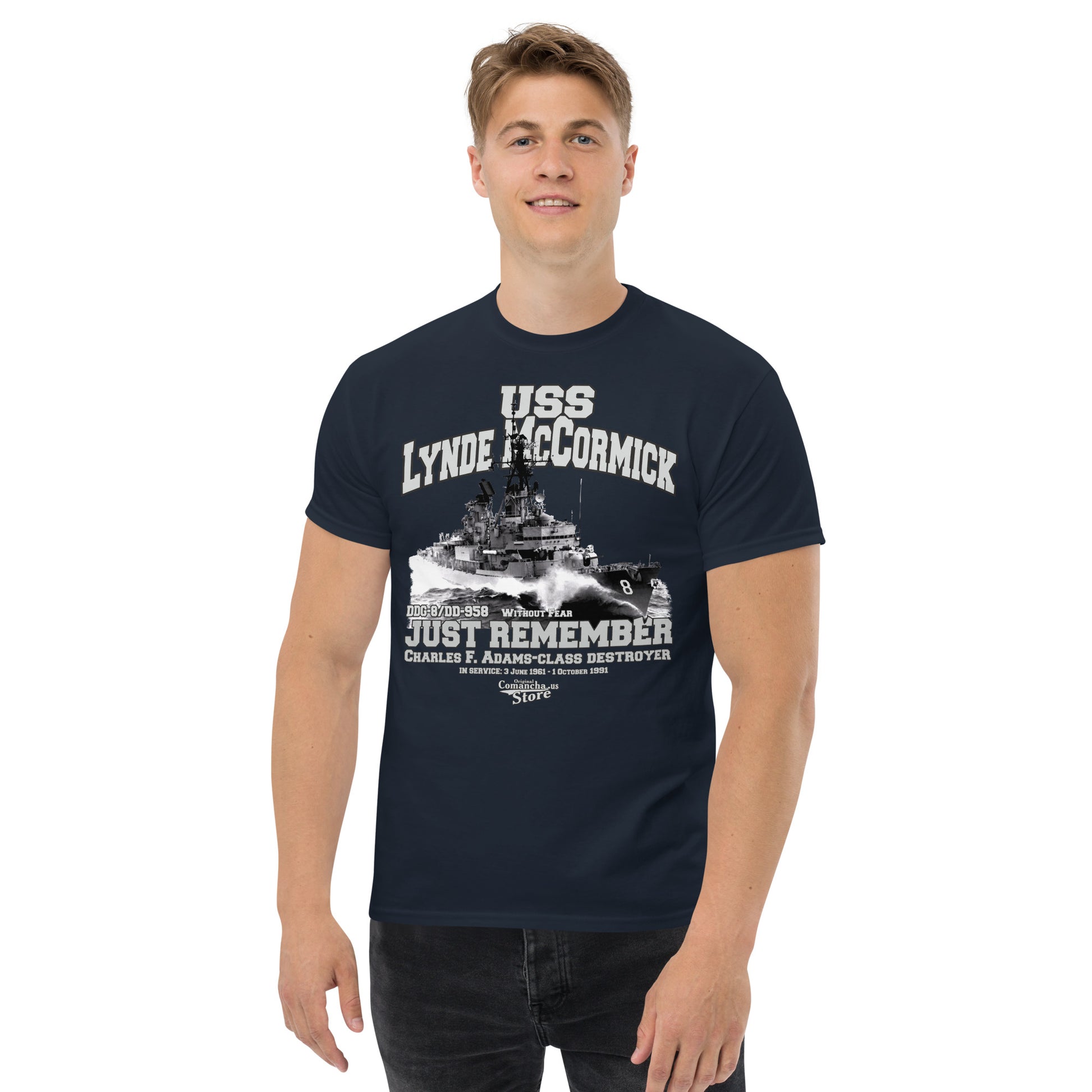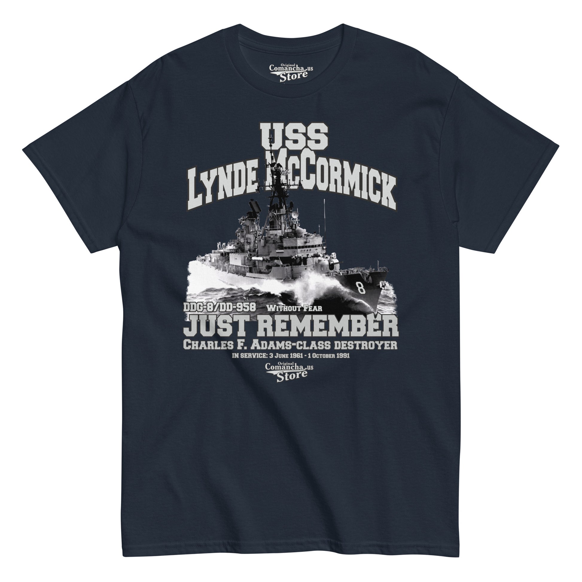 USS Lynde McCormick t-shirt, USS Lynde McCormick DDG-8 t-shirt, USS Lynde McCormick DD-958/DDG-8 was a Charles F. Adams-class destroyer in the United States Navy. Comancha Graphics Store.The 100% cotton men's classic tee will help you land a more structured look. It sits nicely, maintains sharp lines around the edges, and goes perfectly with layered streetwear outfits. Plus, it's extra trendy now!