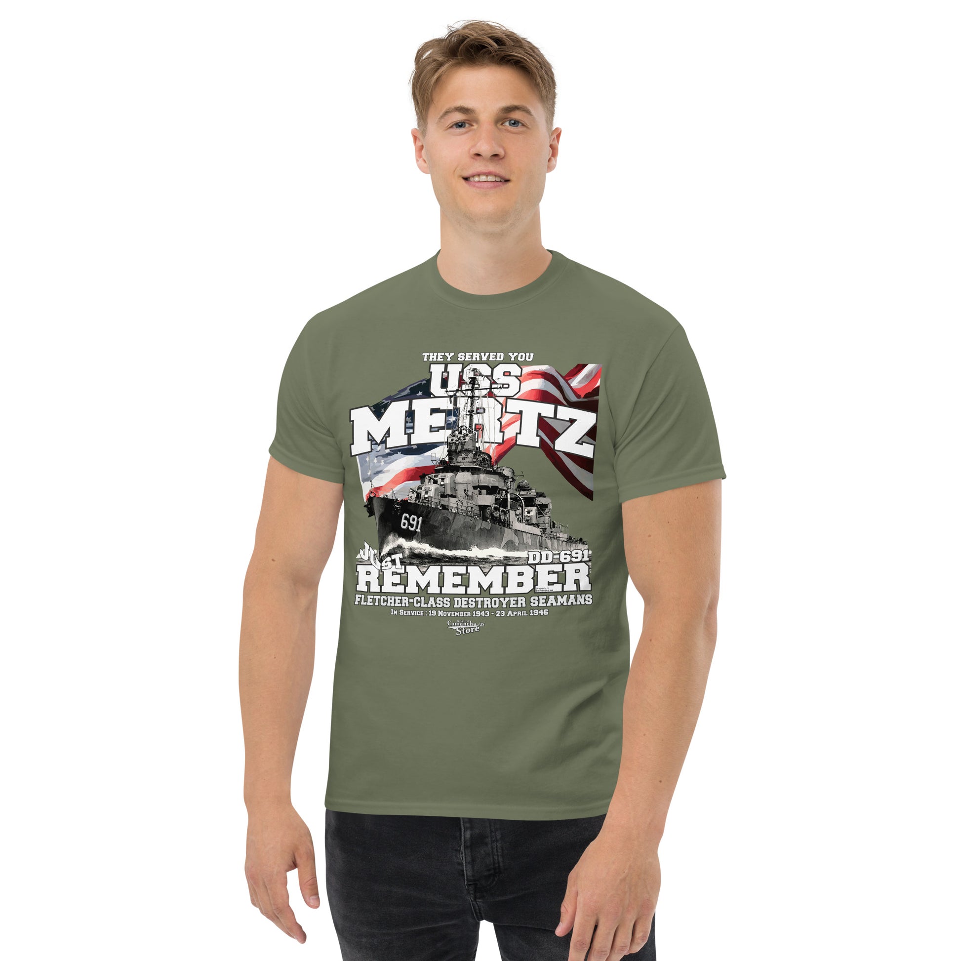USS Mertz DD-691 destroyer t-shirt, USS Mertz (DD-691), was a Fletcher-class destroyer in the service of the United States Navy from 1943 to 1946. Comancha Store,
