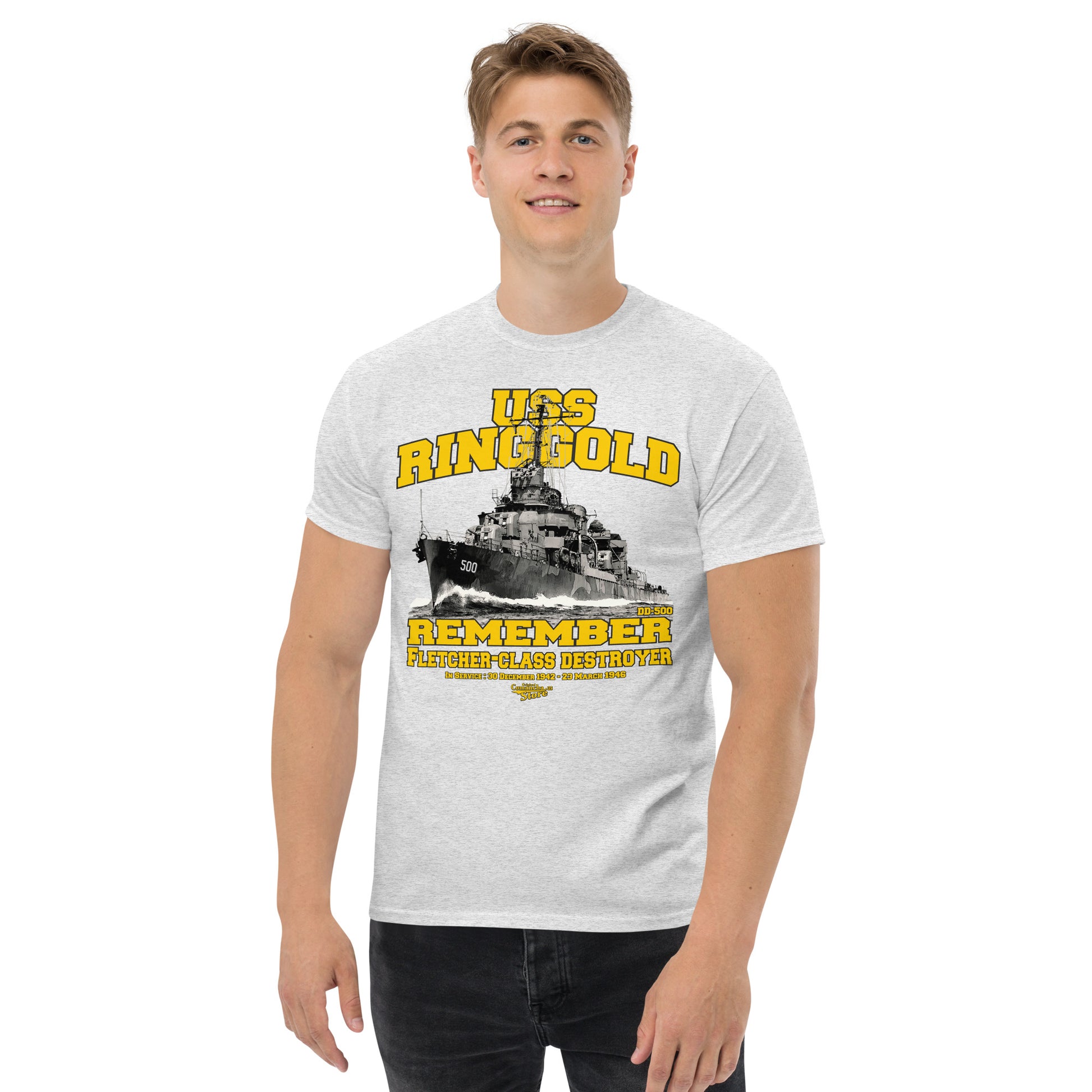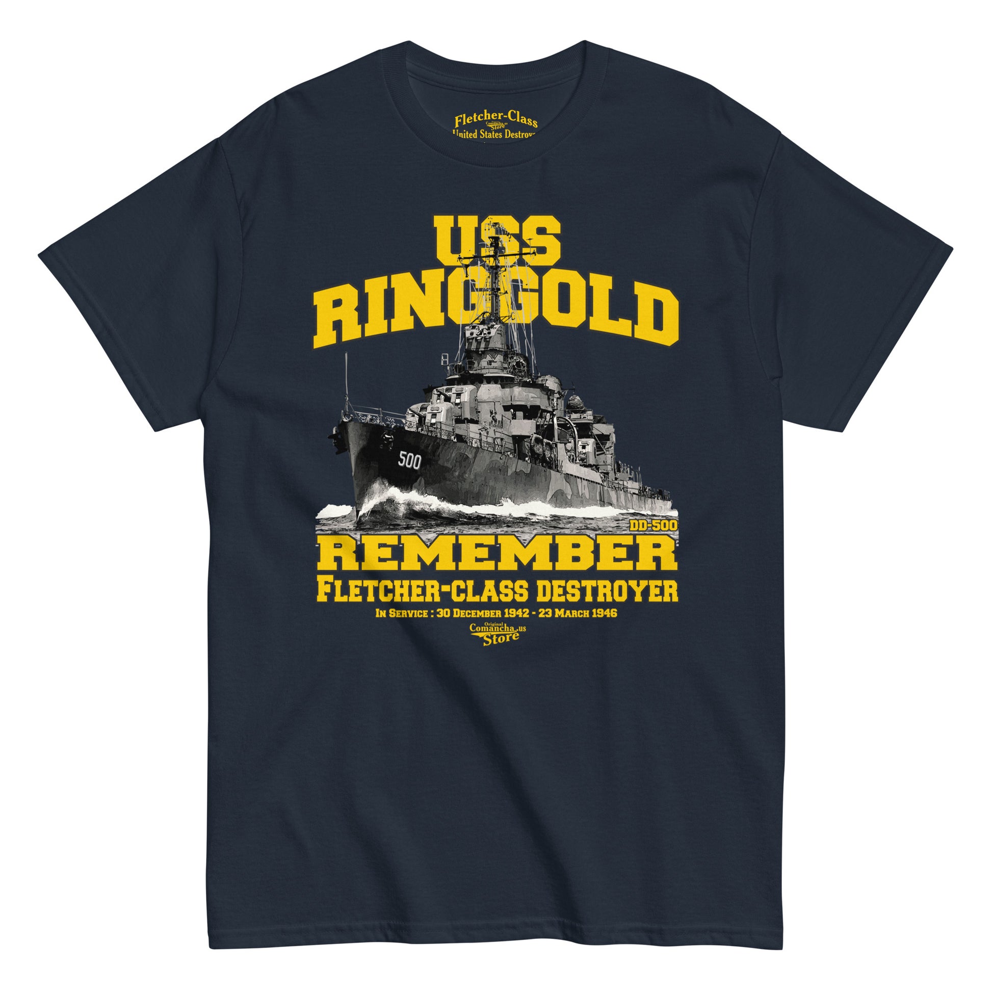 USS Ringgold DD-500 destroyer t-shirt, USS Ringgold (DD-500), a Fletcher-class destroyer, was the second ship of the United States Navy to be named for Rear Admiral Cadwalader Ringgold (1802–1867). Entering service in 1942 during World War II, the destroyer served in the Pacific theater. Comancha Graphics.