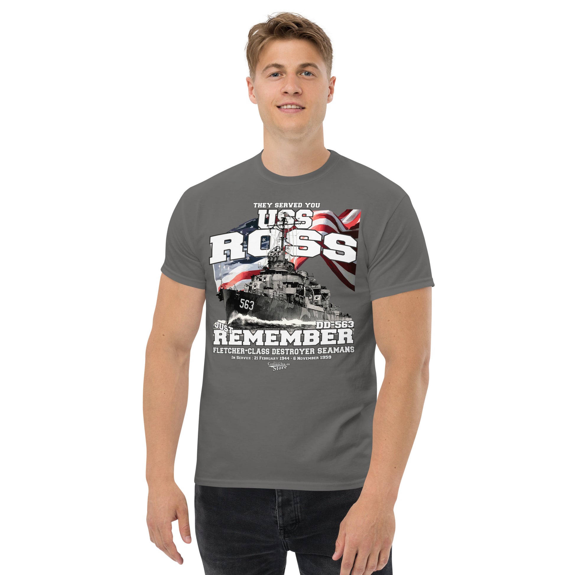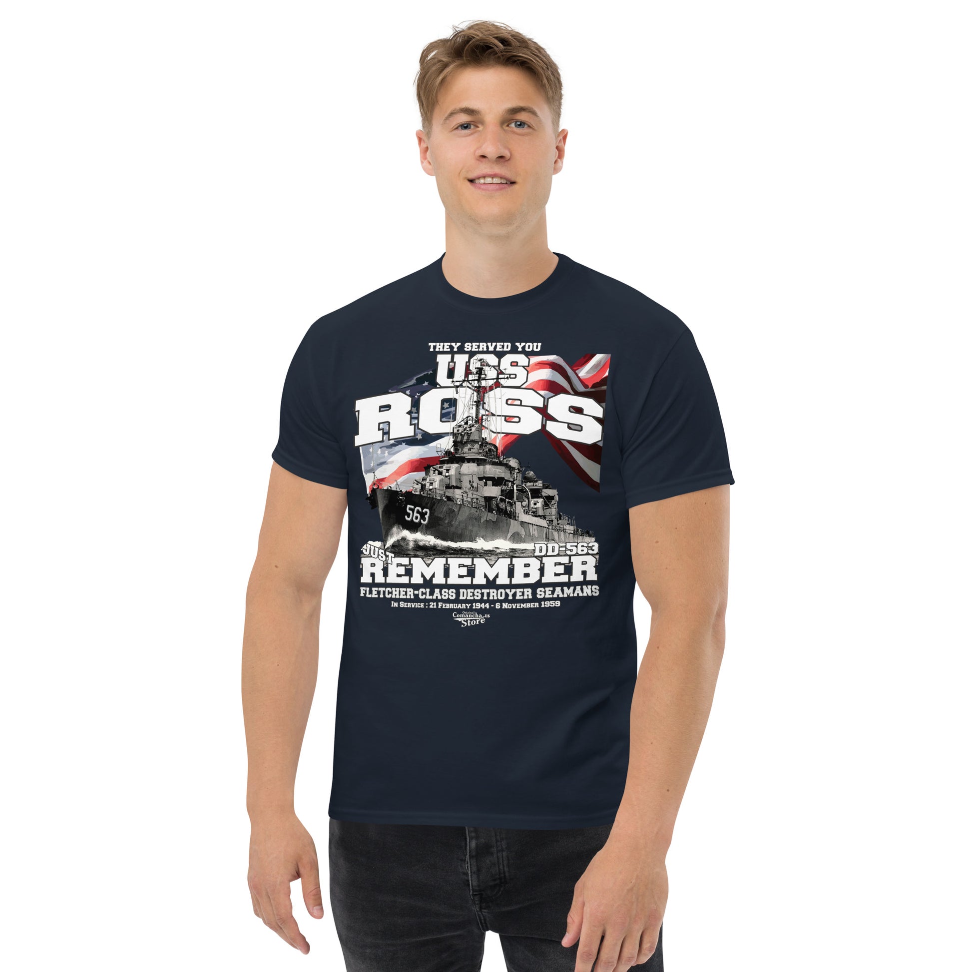 USS Ross DD-563 destroyer t-shirt, USS Ross (DD-563), was a U.S. Navy Fletcher-class destroyer. Ross is the only ship in U.S. naval history to survive two underwater mine explosions, Comancha T-shirts Store,