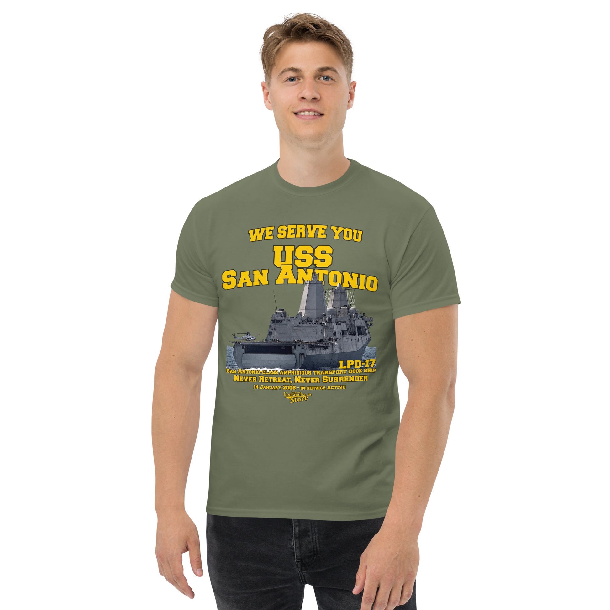 USS San Antonio LPD-17 Shipmates t-shirt, USS San Antonio (LPD-17), the lead ship of her class of amphibious transport dock or landing platform dock, is the first ship of the United States Navy, Comancha T-shirts Store,