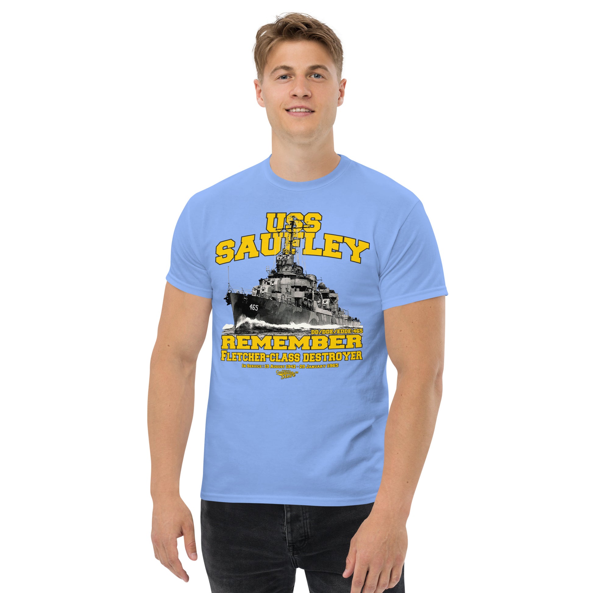 USS Saufley DD-465 Destroyer T-shirt, USS Saufley DD/DDE/EDDE-465, a Fletcher-class destroyer, was a warship of the United States Navy named for pioneering Naval Aviator, Lieutenant Richard Saufley, USN.