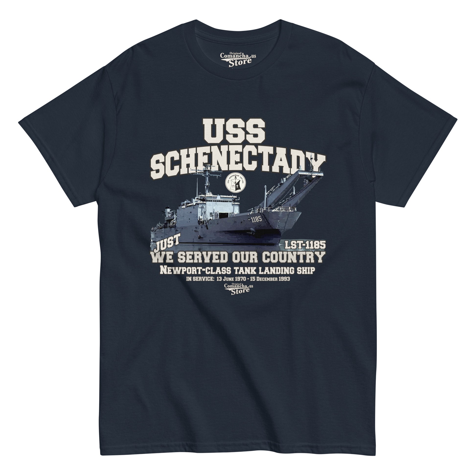 USS Schenectady LST-1185 T-shirt, USS Schenectady Shipmates T-shirt, USS Schenectady (LST-1185) was the fifth Newport-class tank landing ship which replaced the traditional bow door-design tank landing ships (LSTs), Comancha T-shirts Store,