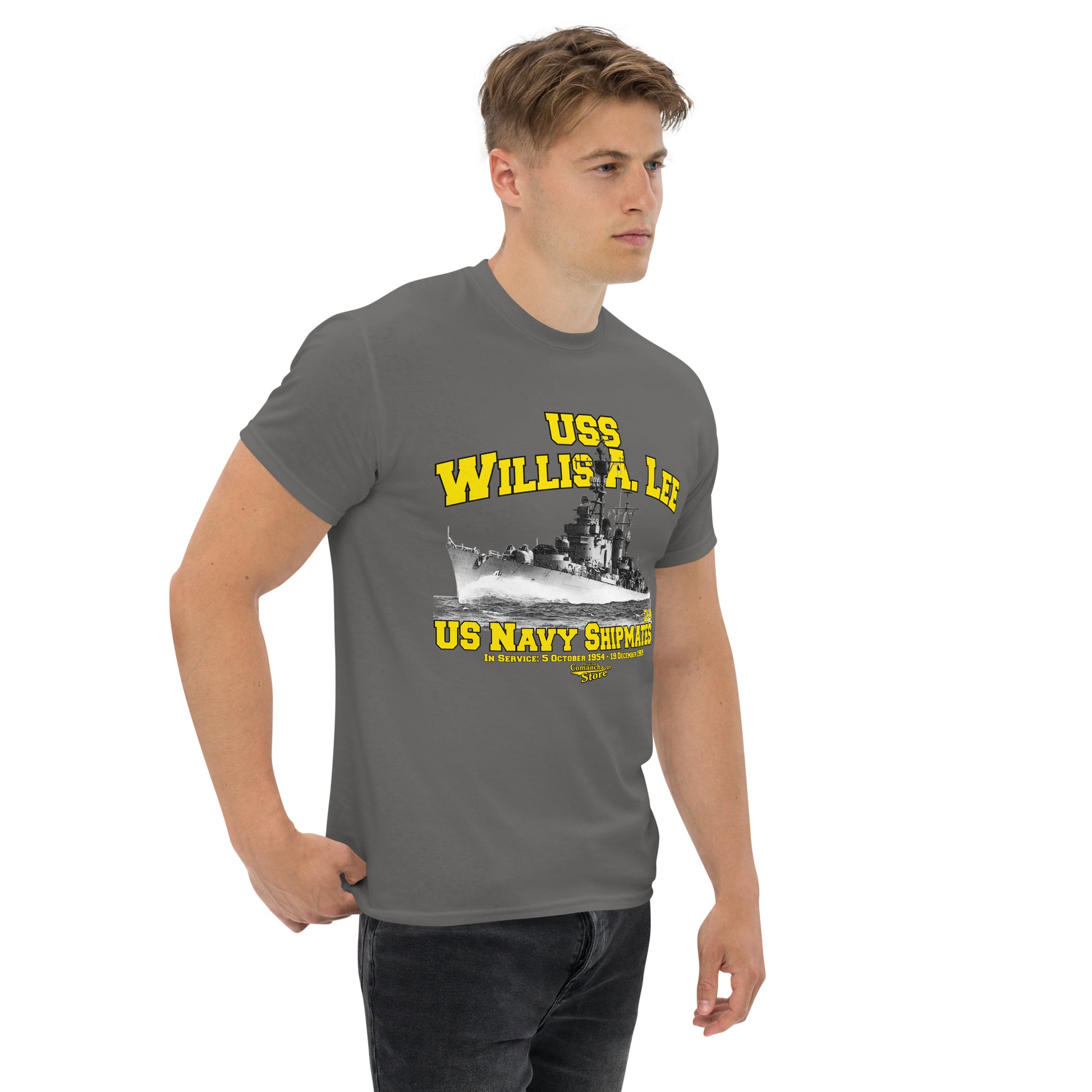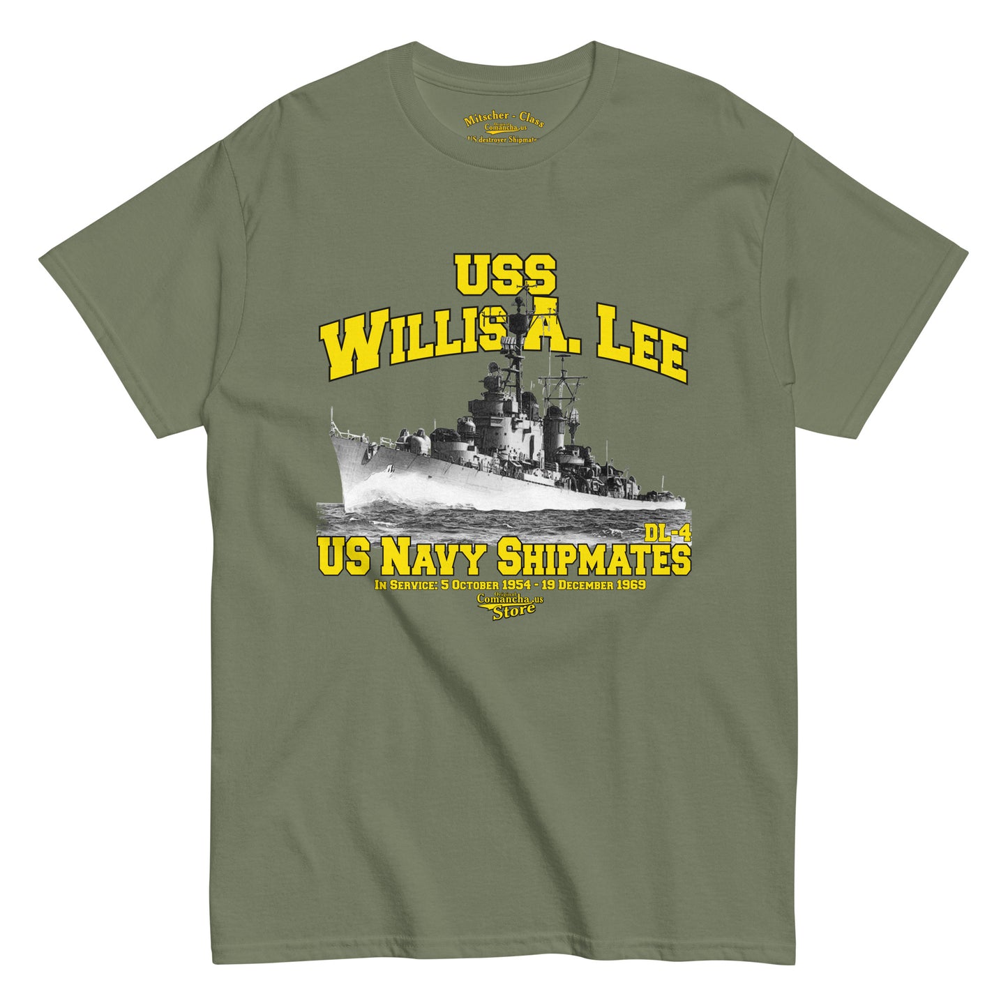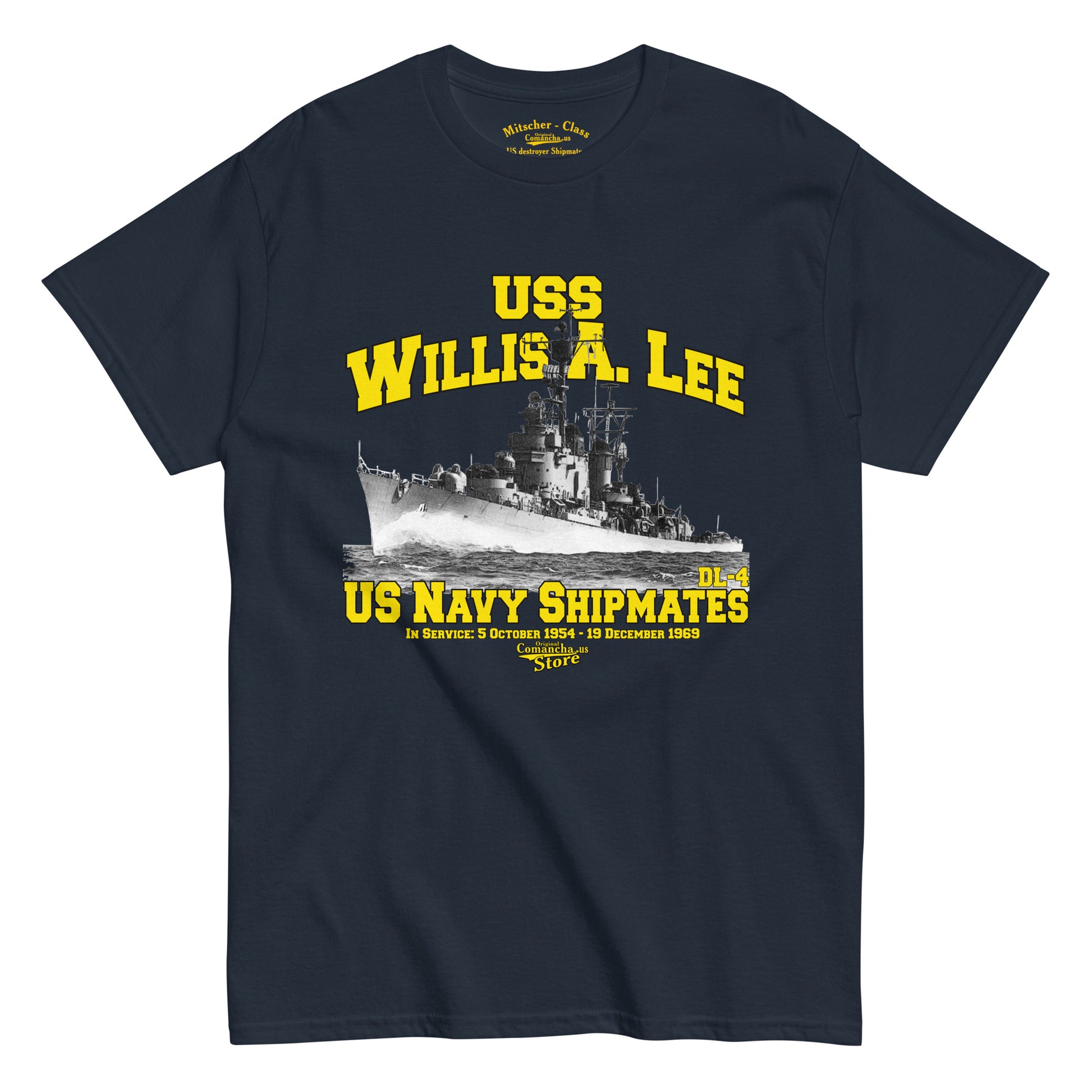 USS Willis A. Lee DL-4 Destroyer t-shirt, USS Willis A. Lee (DD-929) was a Mitscher-class destroyer in the United States Navy. She was named for Vice Admiral Willis A. "Ching" Lee USN (1888–1945). Comancha Store,