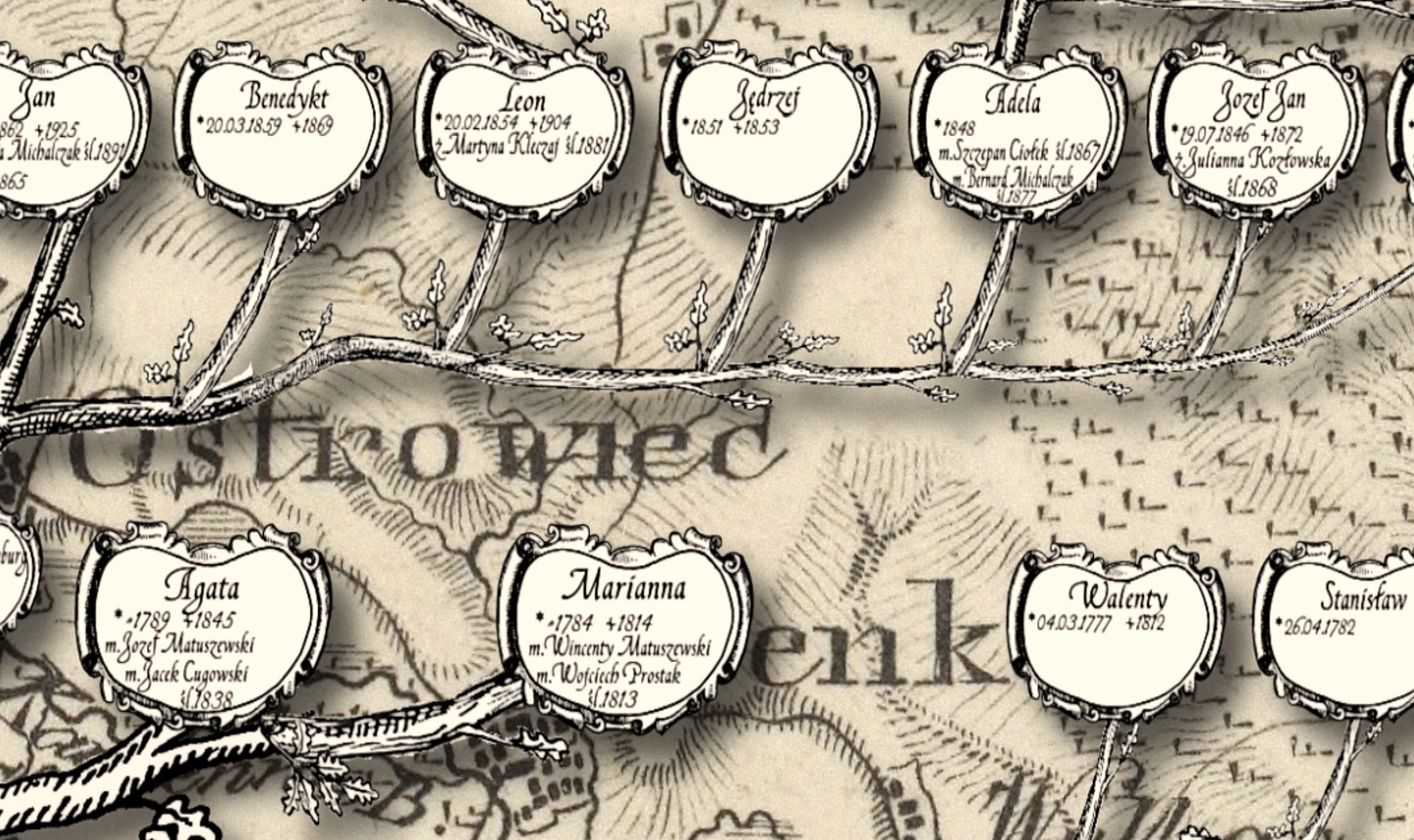 Drzewo rodzinne na tle Mapy ziemi świetokrzyskiej.