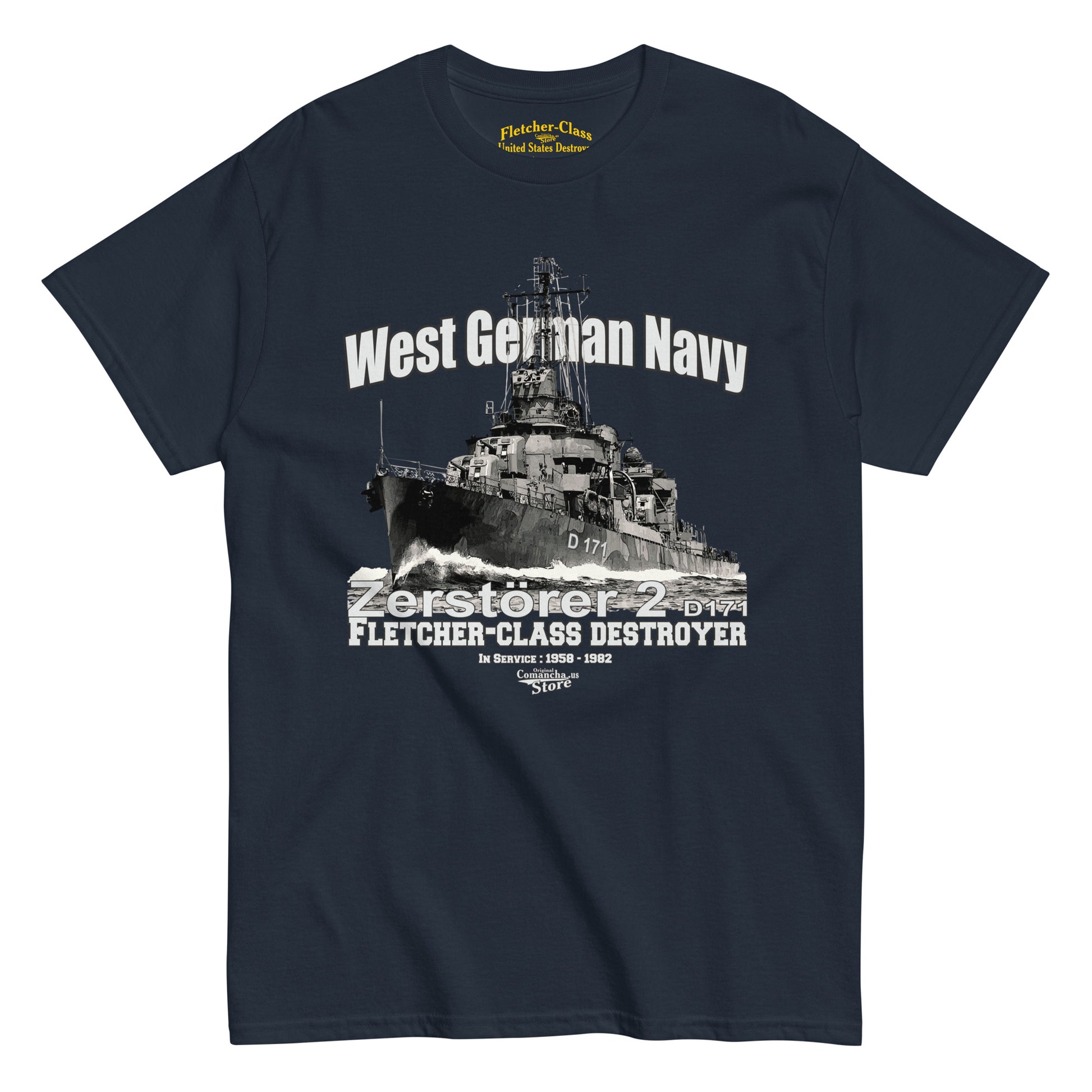 Zerstörer 2 D171 T-shirt, Fletcher-class destroyer, Following the war the ship was placed in reserve before being transferred to the West German Navy and renamed Zerstörer 2 in 1959. In 1981 the destroyer was transferred to the Hellenic Navy and was renamed Kimon. Comancha Store.